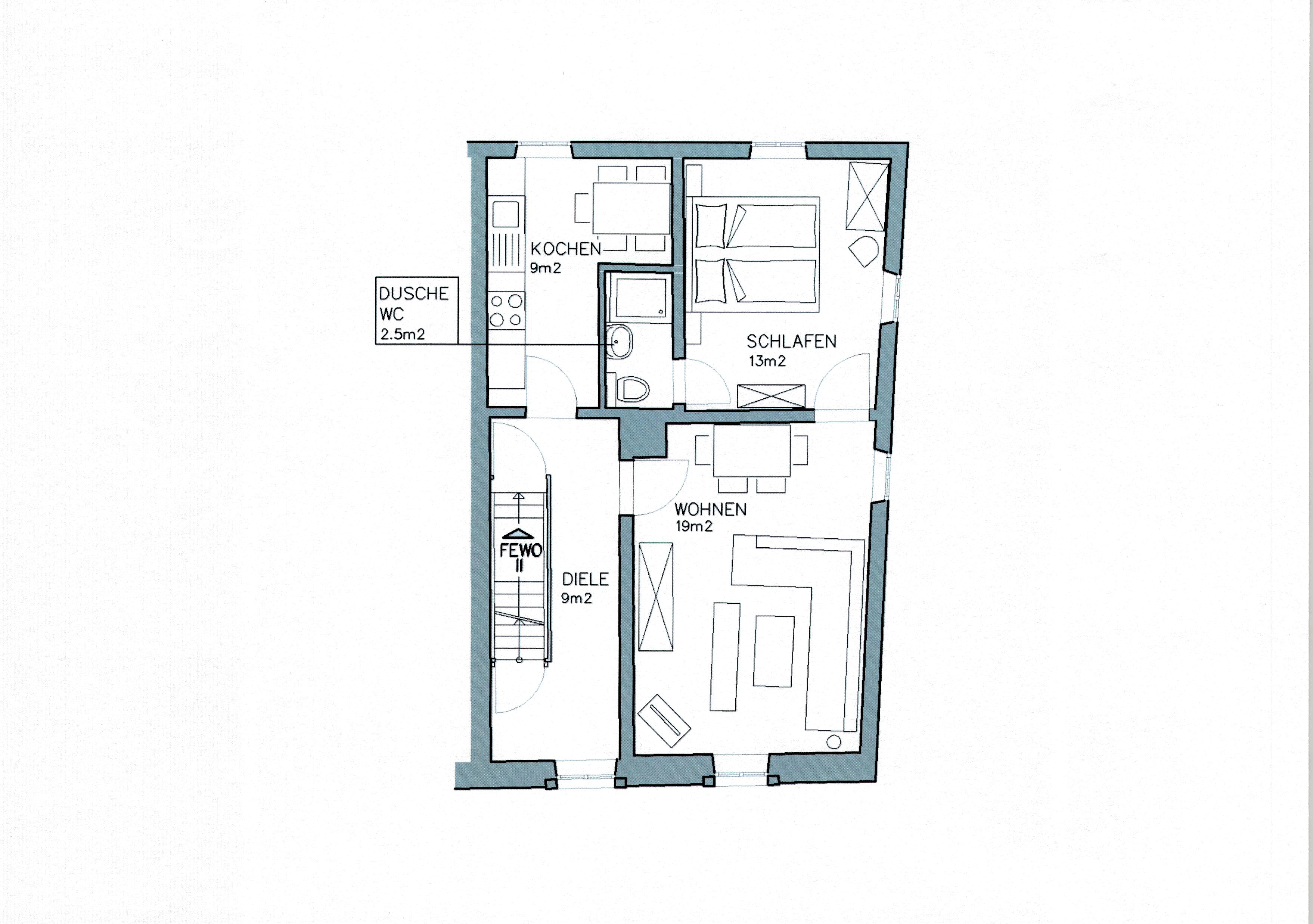 I. OG 53 m², ausgestattet mit Wohnzimmer mit Essecke, Doppelschlafzimmer, komplett eingerichteter Küche mit Essecke und Spülmaschine, Du/WC und Diele. (bis zwei Personen nur I.OG)