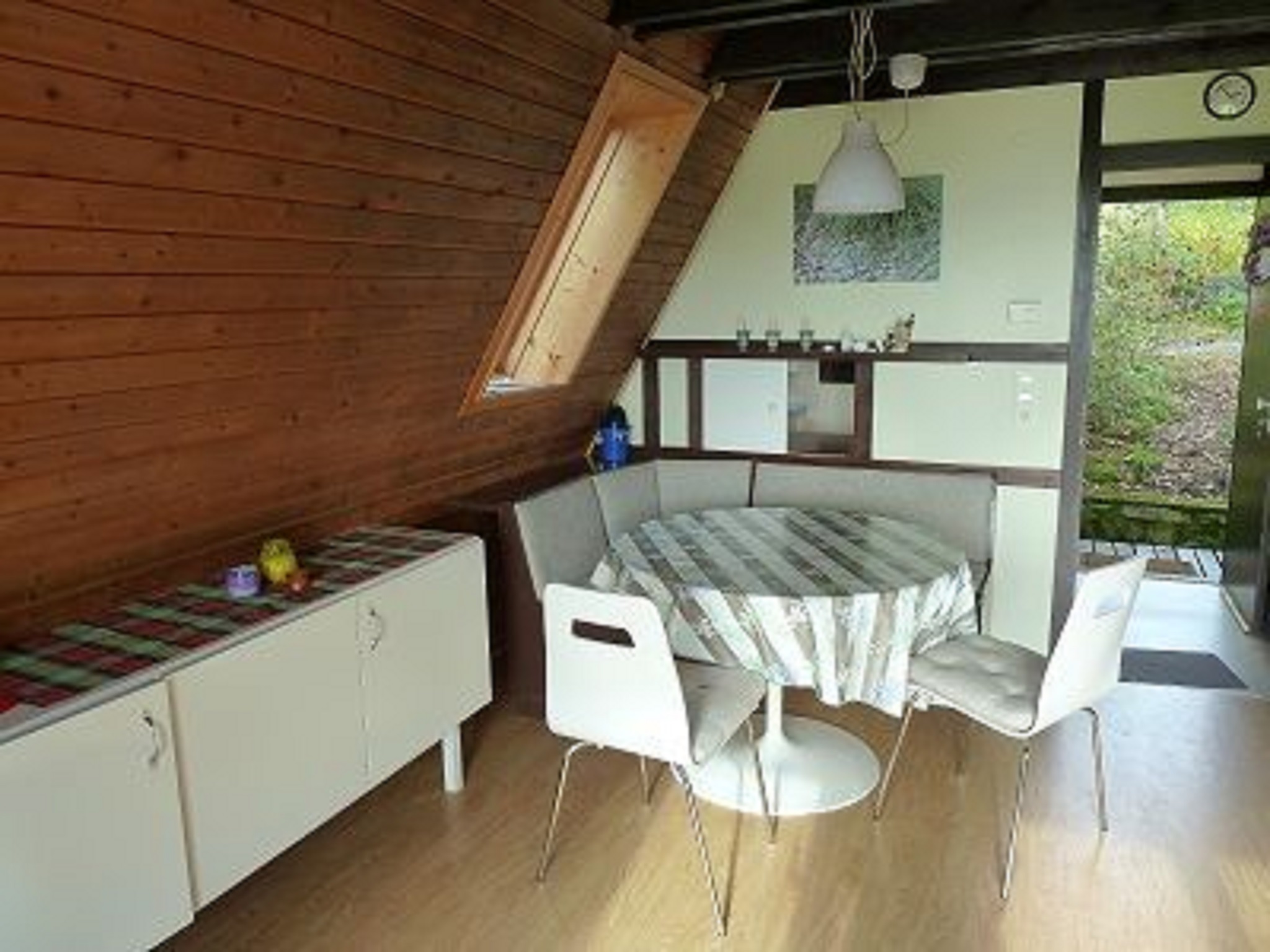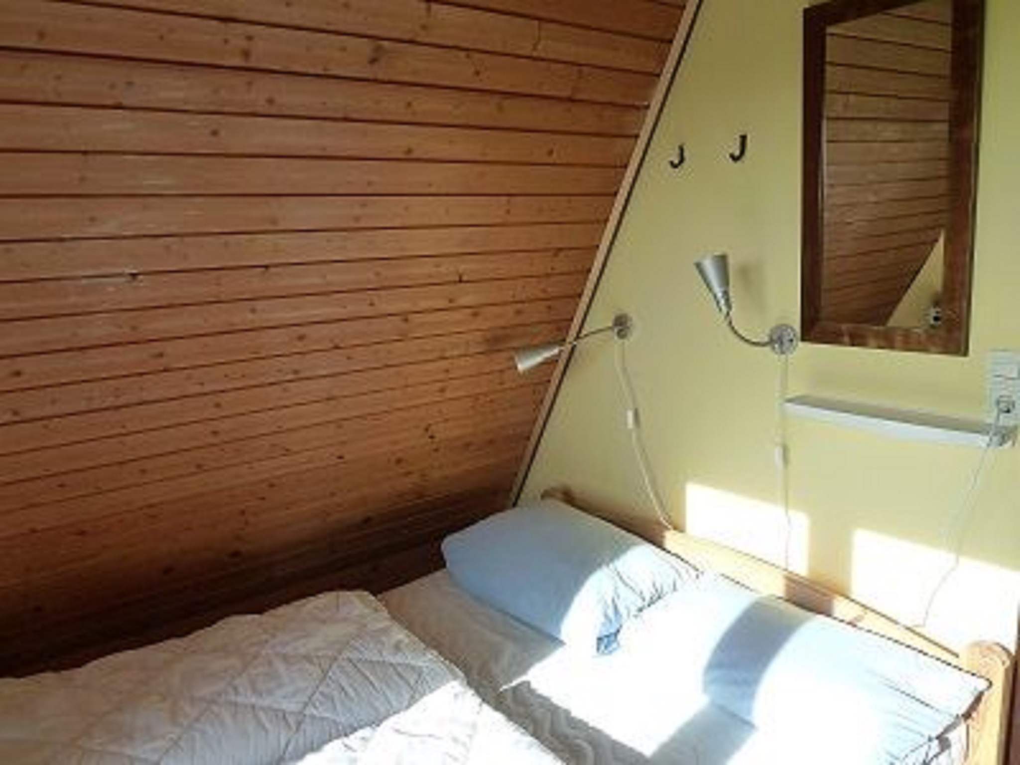Vom Wohnraum aus führt eine Wendeltreppe ins Obergeschoss zu den beiden Schlafräumen. Im Kinderschlafzimmer sind zwei Einzelbetten, im Elternschlafzimmer ein Doppelbett (140x200). Als fünften Schlafplatz lässt sich die ausziehbare Couch im Wohnzimmer verwenden.