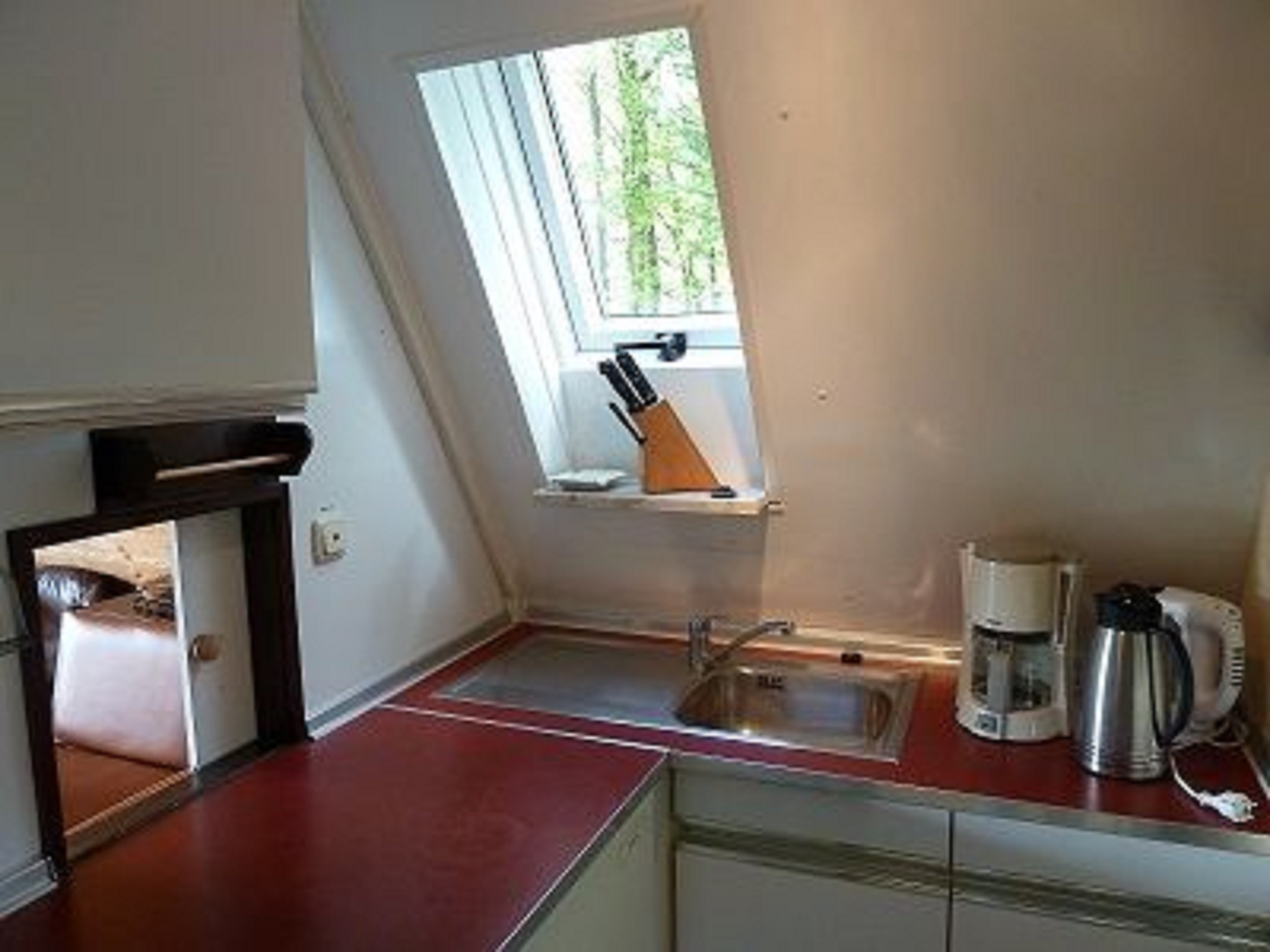 Im Erdgeschoss befindet sich eine Küche ausgestattet mit Wasserkocher, Toaster, Kaffeemaschine, Geschirr, Töpfen, Besteck sowie mit einem Herd mit Backofen.