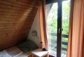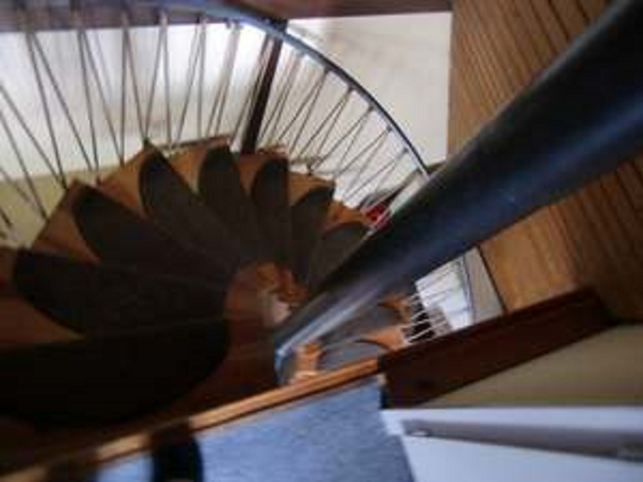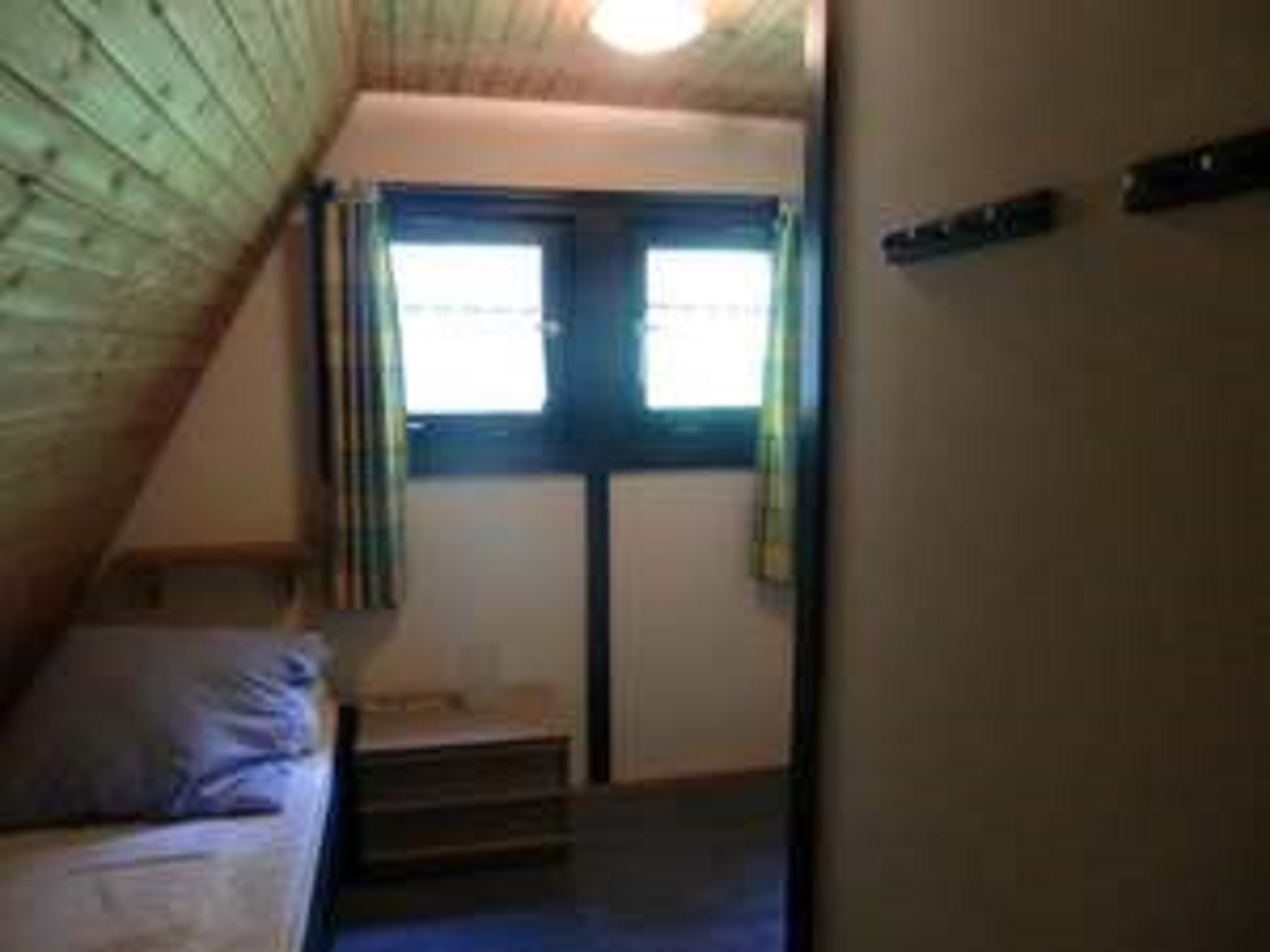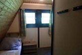 Vom Wohnraum aus führt eine Wendeltreppe ins Obergeschoss zu den beiden Schlafräumen mit jeweils zwei Einzelbetten.