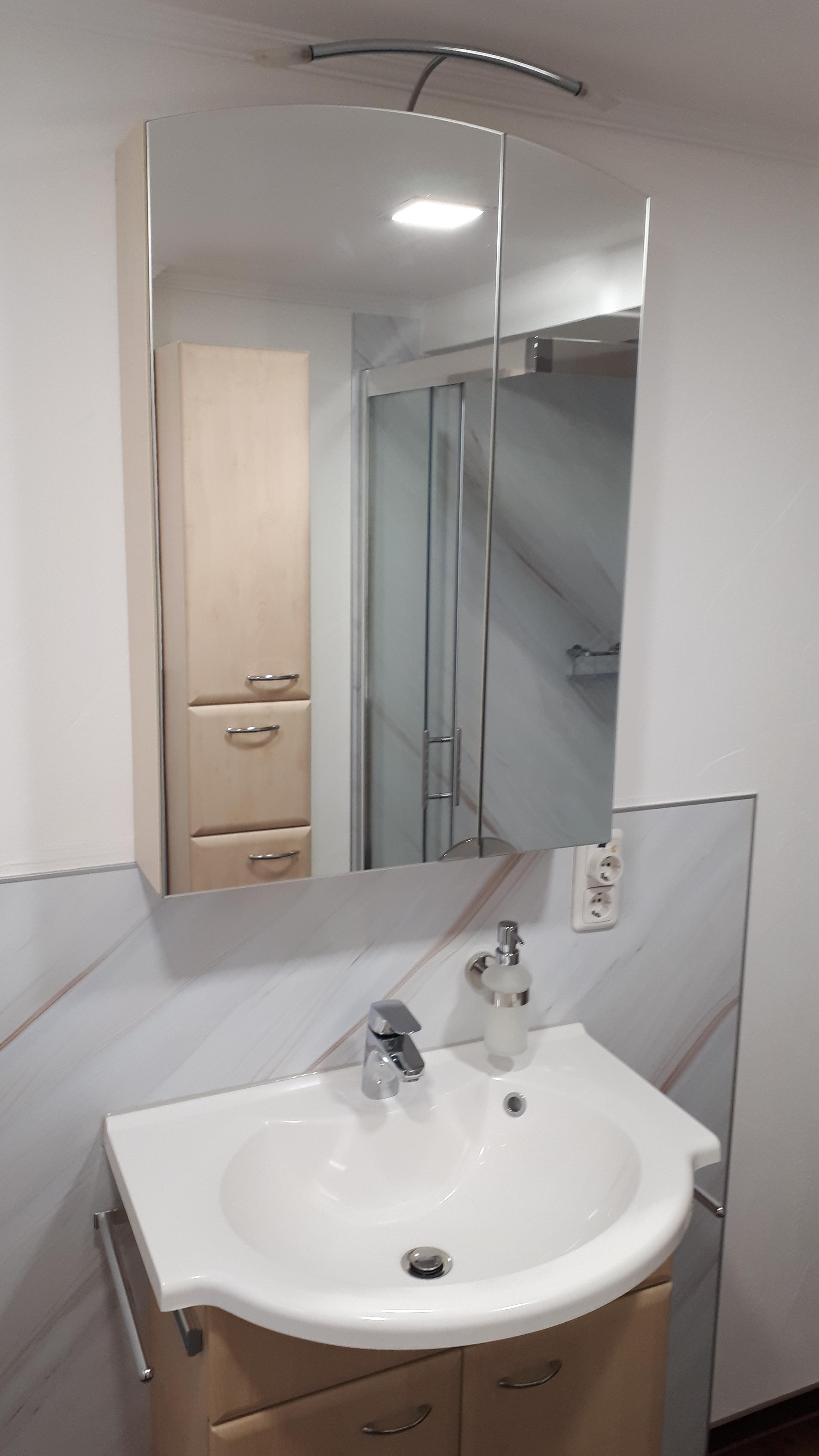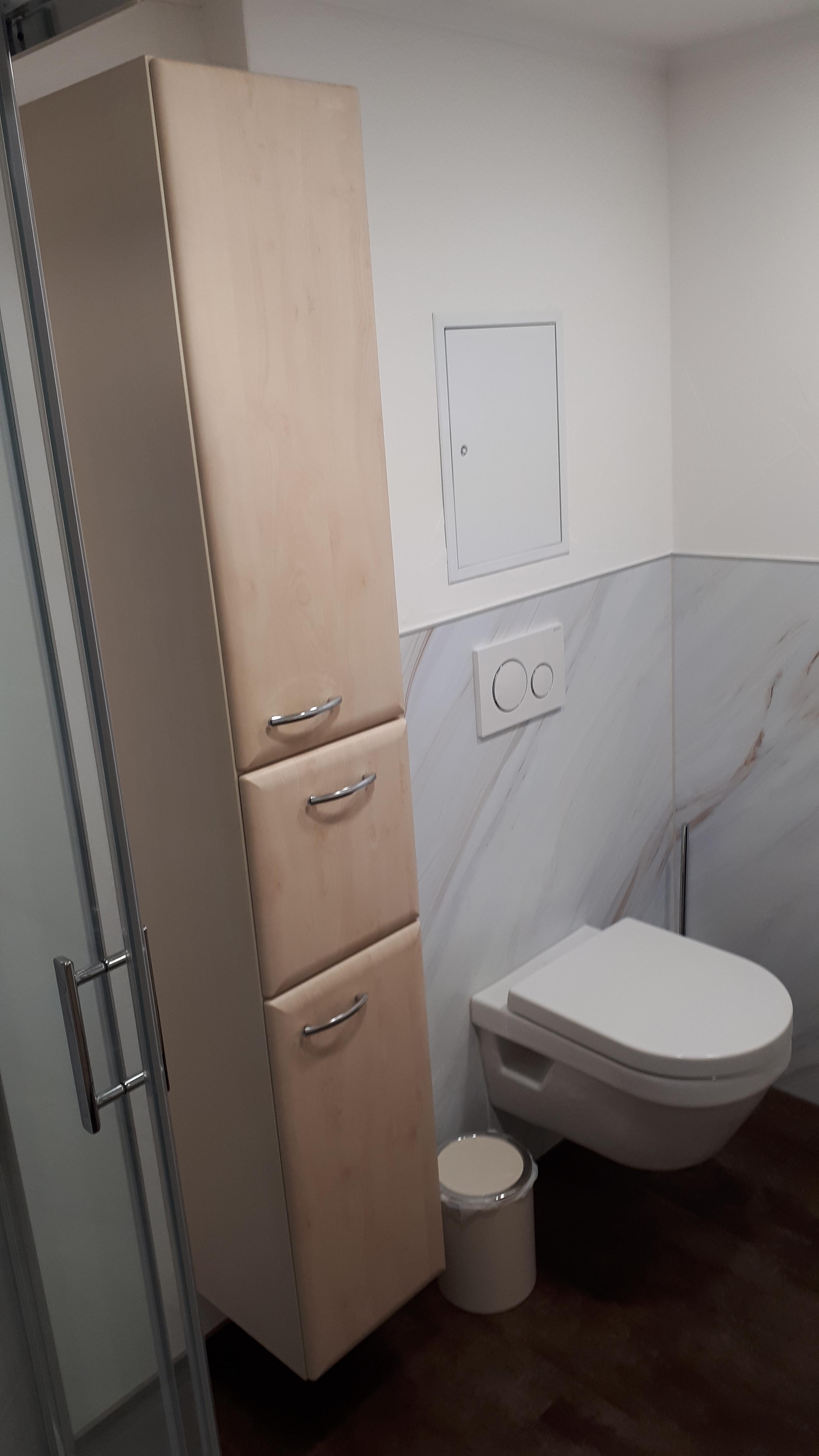 Im Bad befindet sich neben einer Dusche auch eine Badewanne, ein WC und ein Fön.