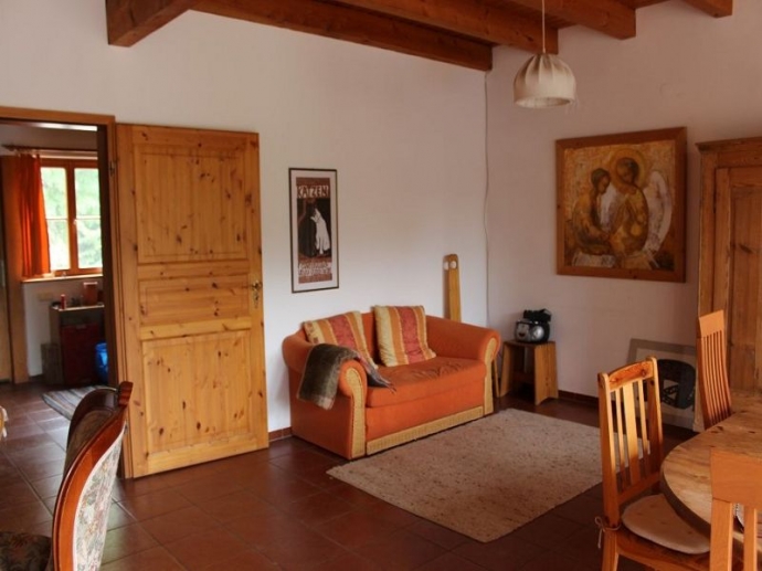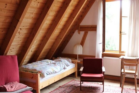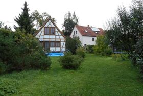 Das Gästehaus der Ehemaligen Schloßmühle liegt am Rande der Ortschaft Ebelsbach am Ebelsbach in der Nähe von Bamberg.Dieses ist ein ökologischer Fachwerkbau in dem viel Holz verwendet wurde. Im Erdgeschoss ist ein großer Ess-/Wohnraum mit einer Liege und einem offenen Kamin. Im Dachgeschoß befinden sich ein großer Schlafraum mit 3 Betten und mehreren Schlafsesseln, außerdem zwei Einzelzimmer, alle mit schrägen Wänden.Küche, Gäste-WC und Bad/WC liegen im Erdgeschoß. Für kletterfähige Kinder gibt es unter dem Giebel ein Schwalbennest mit zwei Futonbetten. Vor dem Haus ist ein sonniger Sitzplatz, eine größere Wiese und eine Sauna. Waschmaschine und Parkplätze sind vorhanden.Das Haus ist sehr ruhig, nur manchmal hören Sie bei Südwind die Autobahn oder die Bahn.