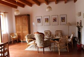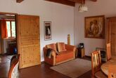 Im Erdgeschoss gibt es einen großen Wohn- und Essraum, im Dachgeschoss drei Zimmer mit schrägen Wänden (36qm) mit 3 Betten und zwei kleinen Einzelzimmern von 5 und 6 qm. 3 zusätzliche Ausziehmöbel sind vorhanden und nur für kletterfähige Kinder (ab ca 8-9 Jahren), ein Schwalbennest unter dem Giebel mit 2 Futonbetten, dazu 1 Bad/WC und ein Gäste-WC, einen Sitzplatz vor dem Haus und eine Wiese, wo sich auch die Sauna befindet. Im Erdgeschoss ist ein 36 qm Wohnraum mit offenem Kamin und einer Liege. Kissen und Decken sind sechs Mal vorhanden.