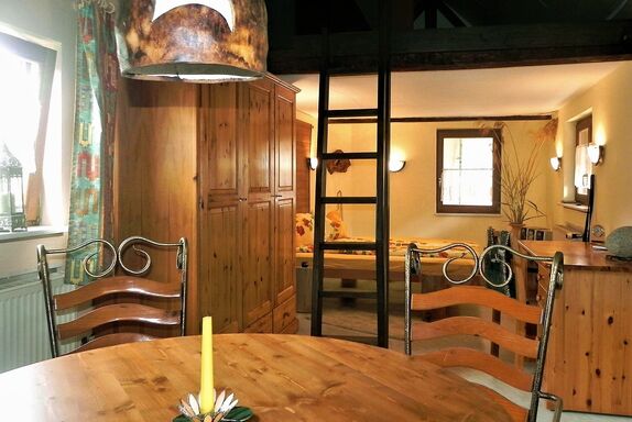 Urgemütliches Gästehäuschen (35m² Wohnfläche) zu vermieten für 2 Personen. Für eine 3. Person gibt es noch ein Räuberbett im Giebel.