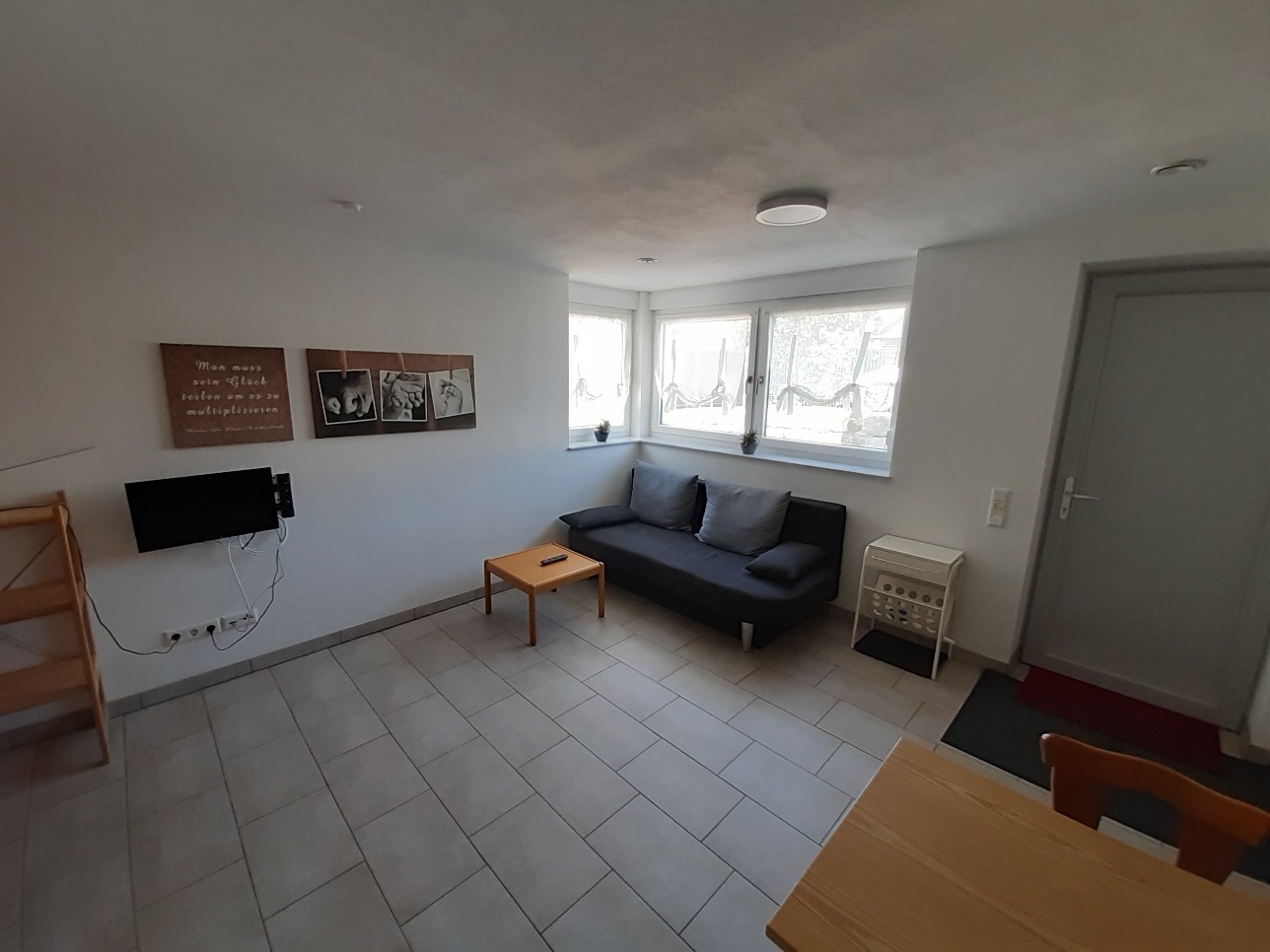 Es erwartet Sie ein behindertenfreundliches, 1,5 Zimmer Appartement mit Terrasse, getrenntem Schlafbereich (1 Doppelbett), Wohn-Essbereich (mit Schlafcouch für 2 Personen 140x185) mit Sat-TV inkl. LAN-Anschluss, kostenfreies WLAN auf Anfrage, Radio inkl. CD-Player und Klappcouch, komplett eingerichtete Küche, Bad mit WC und Dusche (inkl. Föhn),Bettwäsche/Handtücher inklusiv, Kinderbett kostenfrei, PKW-Stellplatz am Haus kostenfrei, inkl. Liegestühle für Terrasse, kinderfreundlich, Spielplatz in unmittelbarer Nähe, Nichtraucherwohnung, kostenloser Abholservice vom Bahnhof Thüngersheim/Würzburg - auch für Rollstuhlfahrer (Aktiv- und Elektrorollstuhl)
