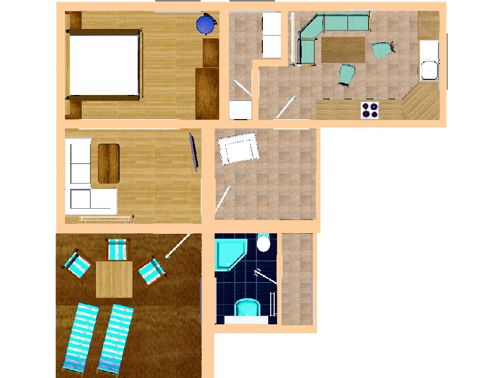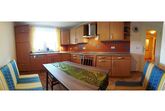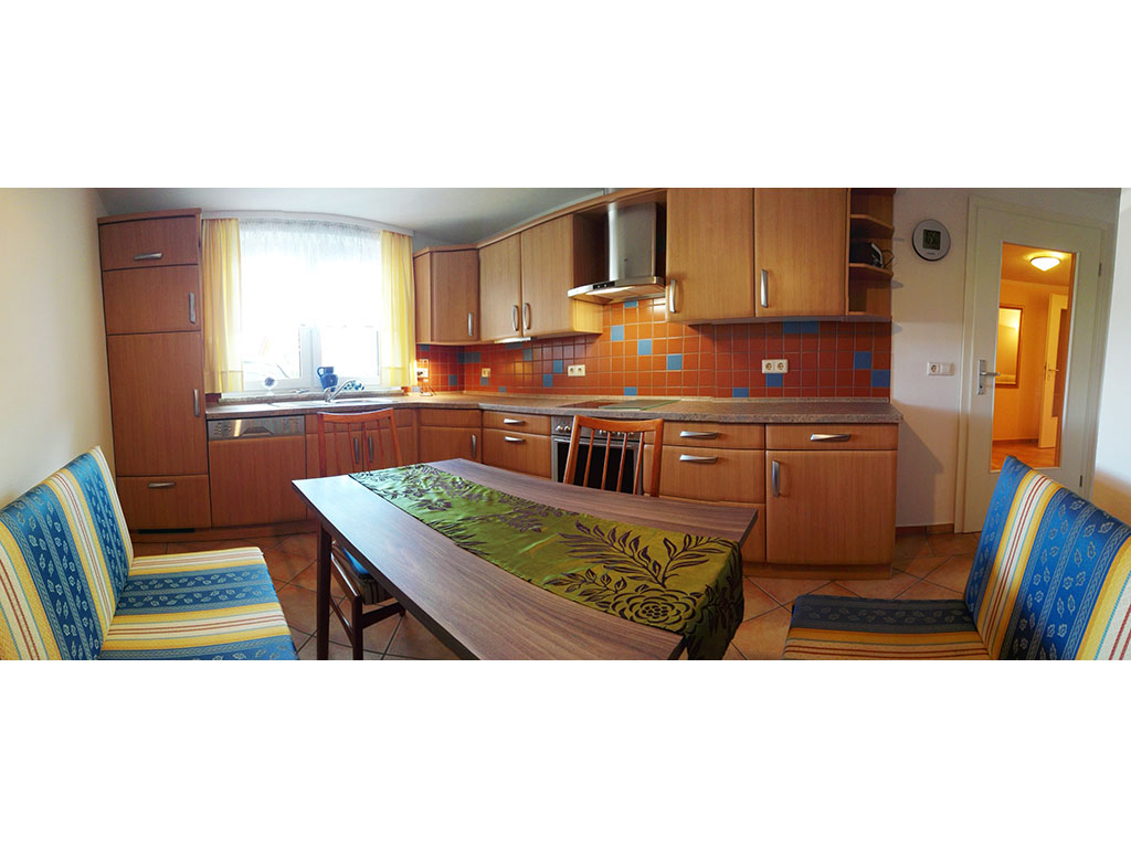 Parterre-Wohnung, die große Wohnküche mit gemütlicher Eckbank und Esstisch ist bestens ausgestattet mit allen erforderlichen Küchenutensilien, Kühlschrank mit Gefrierfach sowie Ceranfeld mit Backofen, Geschirrspülmaschine, Mikrowelle, Kaffeemaschine, Toaster und Wasserkocher, Tischwäsche und Geschirrtücher