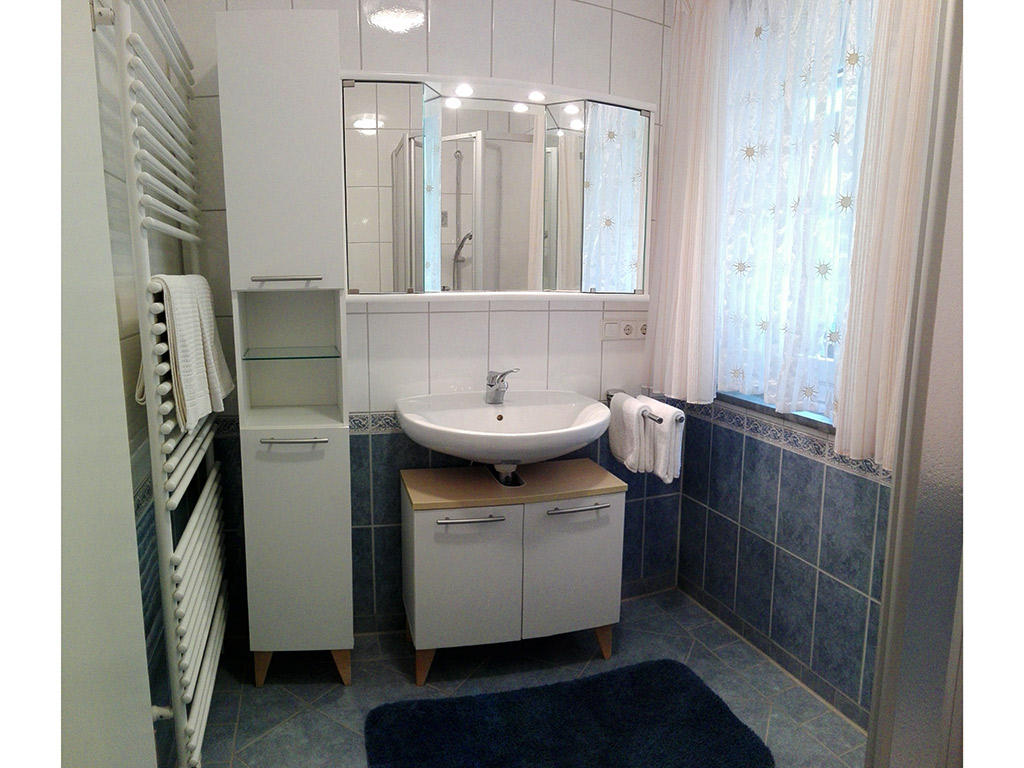 Tageslicht-Bad mit Dusche und WC, Haartrockner, Handtuchtrockner, Hand- und Badetücher (nur zum Gebrauch in der Ferienwohnung).