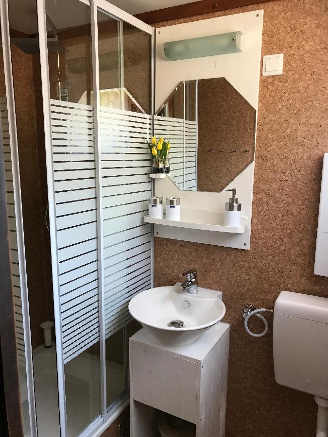 WC, Waschbecken, Spiegel, Durchlauferhitzer und Haartrockner