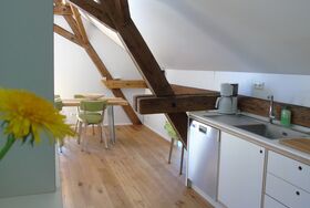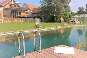 Ganz ruhig und mitten im Naturpark Haßberge, direkt am historischen Rennweg gelegenes, früheres Brauhaus unter Denkmalschutz. Die drei neu ausgebauten, exklusiven Wohnungen und das Doppelzimmer verwöhnen mit vielen Extras zum wohnen und relaxen. Die Einrichtung kommt maßgeschneidert aus der eigenen Schreinerei in natürlichen, edelsten Materialien und Möbeln der Marke Eichenfrau. Nachhaltigkeit, Ökologie und Made-in-Germany werden hier groß geschrieben. Wohlfühlambiente ist somit garantiert. Schöner Garten hinter dem Brauhaus mit maximaler Privatsphäre und Schwimmteich-Biotop. Nur für Erwachsene, keine Haustiere. Freu Dich auf: FEWO Quelle: Liebst Du Ruhe und modernen Komfort, natürliche Oberflächen, großzügiges Wohngefühl? Schätzt Du den direkten Kontakt mit frischer Luft und die freie Sicht auf unverbaute Natur, viel Platz für Dich alleine auch auf der Terrasse? Du magst auch Deinen eigenen Whirlpool mit niemandem teilen - ausser mit deinem Lieblingsmenschen? Egal ob Du gut zu Fuß bist oder nicht, das großzügige und barrierefreie Ambiente der QUELLE wird Dich begeistern. - Apartment Malz: Hier hast Du einen großen Balkon zum Sonnenaufgang und mit weitem Blick in den Garten mit Naturteich, in die grünen fränkischen Hügel, Wälder und Felder. Wenn Du Deine Privatsphäre schätzt und das sonnige Frühstück im Freien mit Vogelgezwitscher nicht missen möchtest, wirst Du Dich hier wohl fühlen und wunderbar erholen.- Apartment Hopfen: Genau richtig bist Du hier, wenn Du tagsüber viel draußen im fränkischen Land unterwegs bist und den Tag gerne gemütlich beginnen und ausklingen lassen möchtest. Oder wenn Du ganz einfach das Gefühl von natürlichen, gewachsenen Materialien unter den Händen liebst und staunend in der ehemaligen Darre unter der großes Regendusche stehen möchtest. Oder Du die wohlige Wärme auf der Haut spüren willst, in Deiner eigenen Infrarotsauna. Willkommen! - Doppelzimmer Gerste: Genau zwischen Hopfen und Malz liegend, kannst Du es dazu buchen. Für eine 3. oder 4. Person oder wenn jeder von Euch sein eigenes Zimmer zum schlafen braucht. Unser Beitrag zum Thema Nachhaltigkeit: Made in Germany, für uns als Schreinerfamilie eine Lebenseinstellung. Die Möbel sind - wo immer möglich - aus heimischen Hölzern und Naturmaterialien von uns selbst entworfen und hergestellt. Kunststoffe versuchen wir so gut es geht zu vermeiden. Auch die allgemeine Ausstattung der Wohnungen ist aus regionaler oder deutscher Produktion mit hohem Qualitätsanspruch und langer Haltbarkeit. Ja, es gibt im Brauhaus 3 auch Klimaanlagen in allen drei Wohnungen! Es klingt wie ein Widerspruch, ist es aber nicht. Denn zu jenen Zeiten, in denen die Klimaanlage gebraucht wird, haben wir ganz viel fränkische Sonne und... unsere Photovoltaikanlagen liefern dann mehr als genug Strom direkt dafür! Wir produzieren und speichern hier rund ums Jahr inzwischen fast doppelt so viel Strom wie wir selbst verbrauchen. Natürlich gibt es noch viel mehr, was wir bereits tun. Dies können Sie auf unserer Website nachlesen: /nachhaltigkeit/