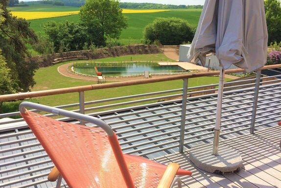 Großer Balkon zum Sonnenaufgang und mit weitem Blick in den Garten mit Naturteich und Sauna, in die grünen fränkischen Hügel, Wälder und Felder.