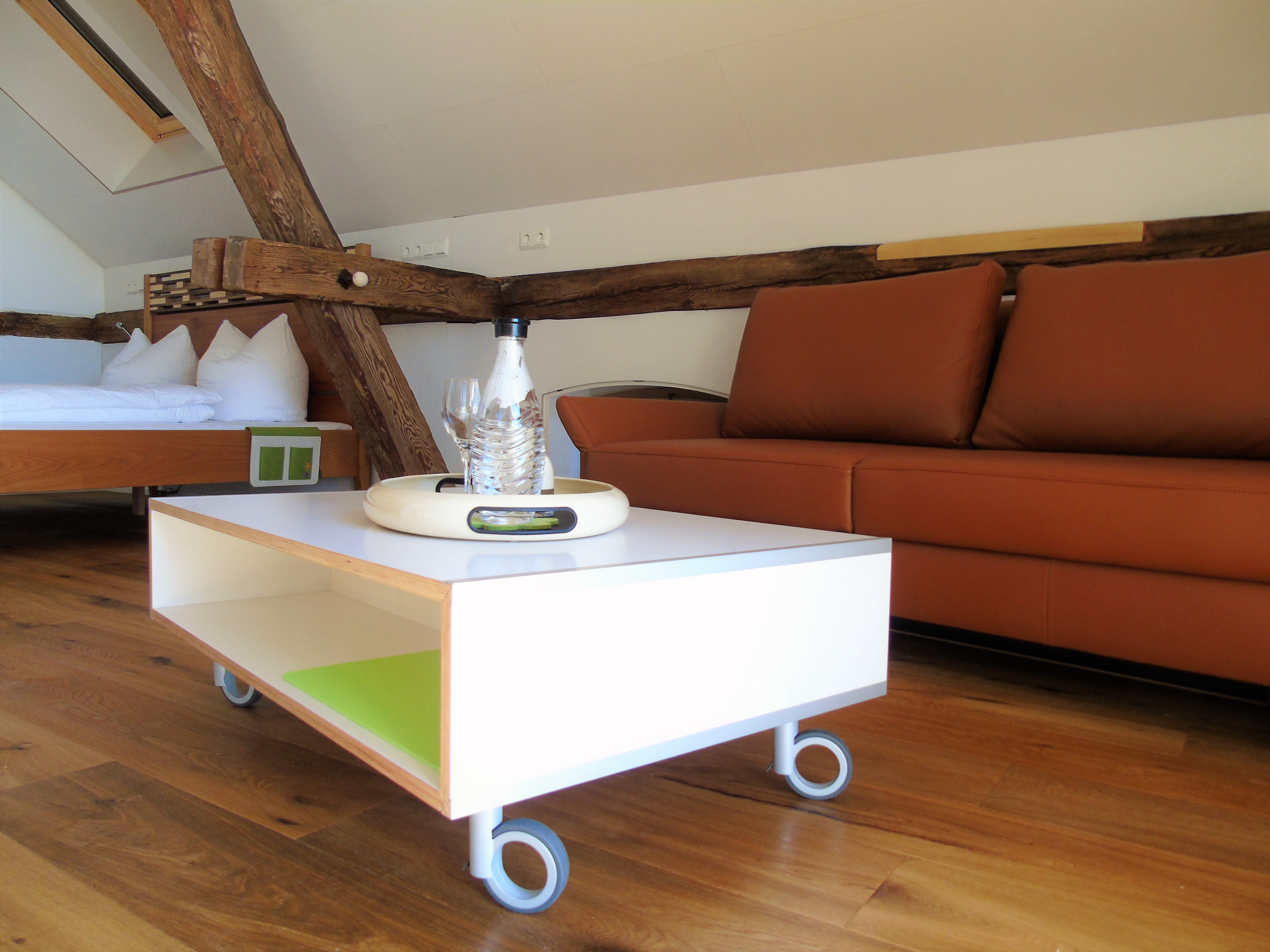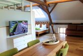 Helles Design-Apartment für 2 Gäste. 52 qm Wohnfäche und 22 qm Balkon mit der unbestritten schönsten Aussicht ins grüne Land, die das Haus zu bieten hat. Offener Schlafbereich mit Naturholz-Doppelbett Marke Eichenfrau 180x200 cm und Überlängen-Bettwäsche für besonderen Komfort. Echtleder-Schlafsofa Made in Franken in der Kuschelecke, Infrarotsauna für Zwei, großer TV-Flatscreen, moderne Küche mit vielen Extras und Eichenfrau-Essbereich mit eigens angefertigtem, besonders schönem Naturholz-Esstisch, Raum-im-Raum-Bad mit Dusche/Bidet/WC, Klimaanlage.