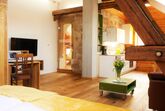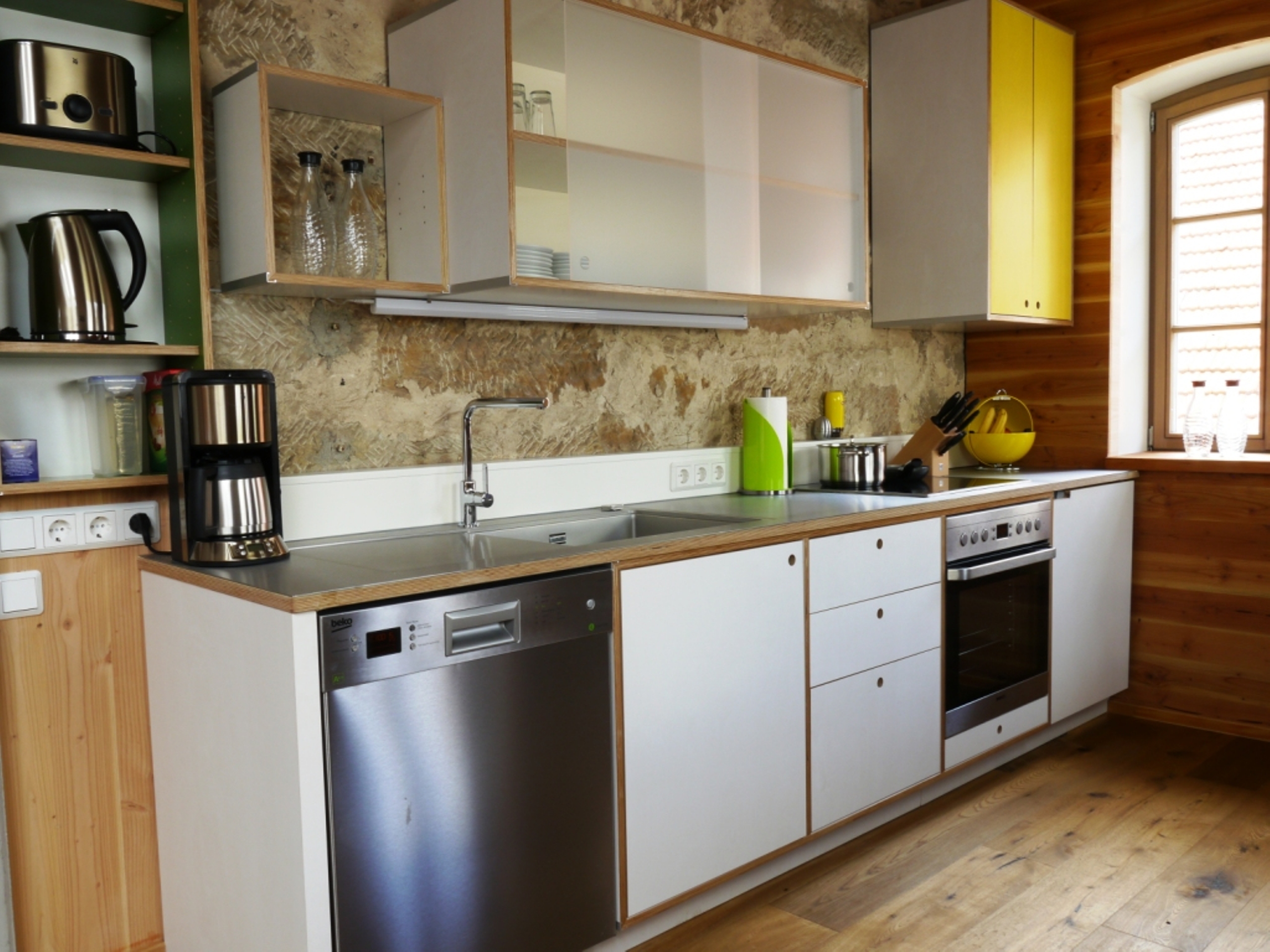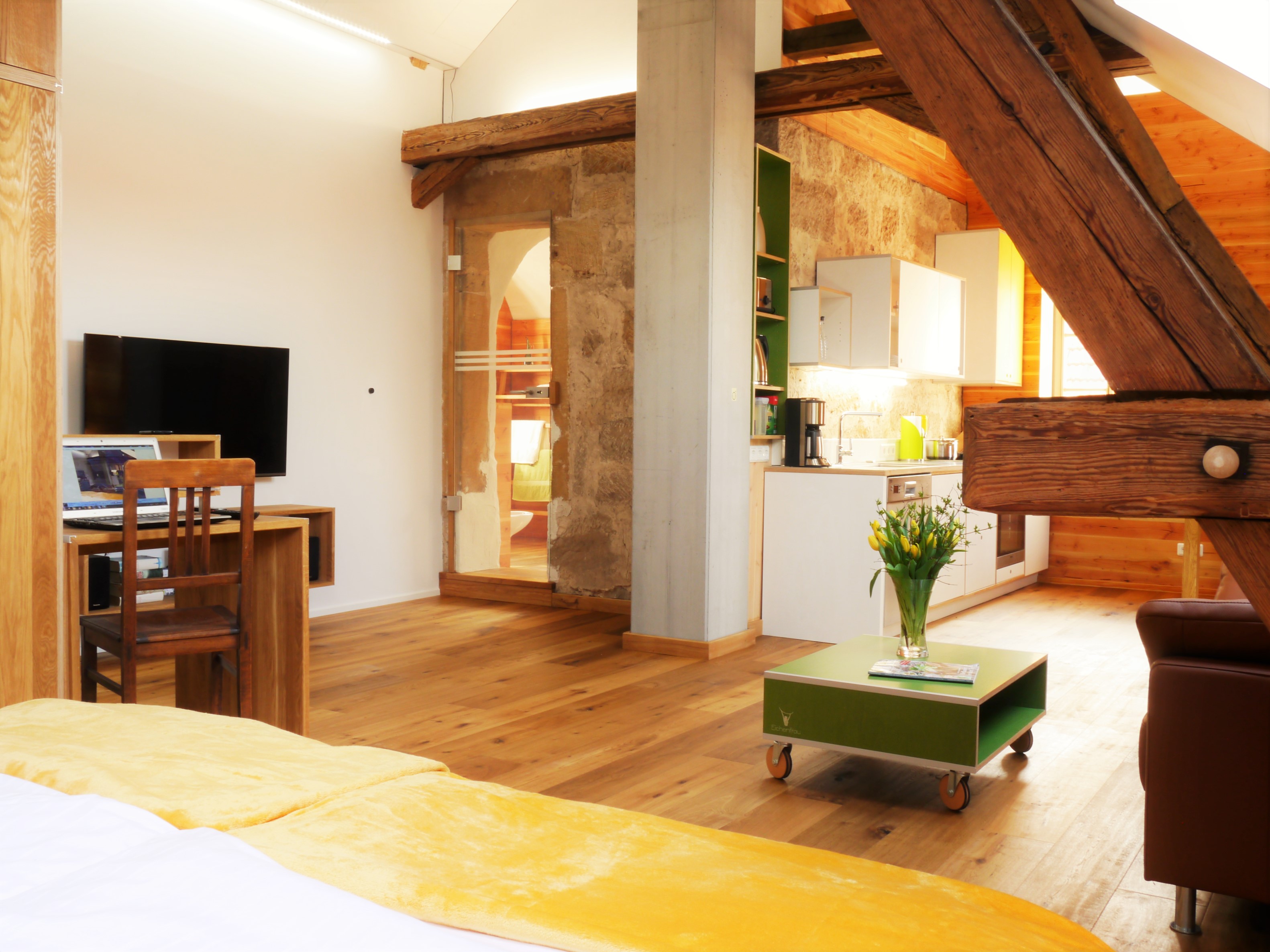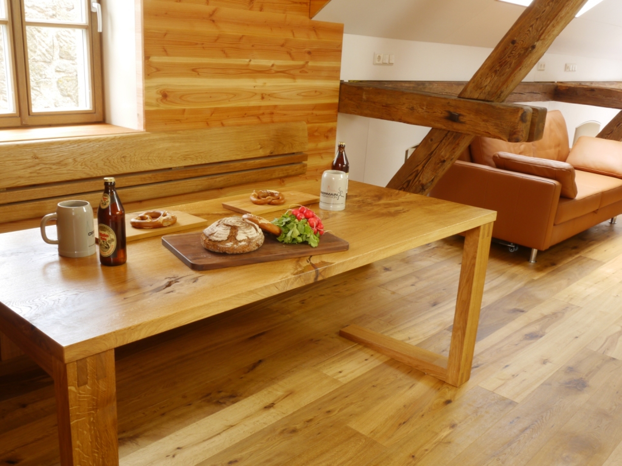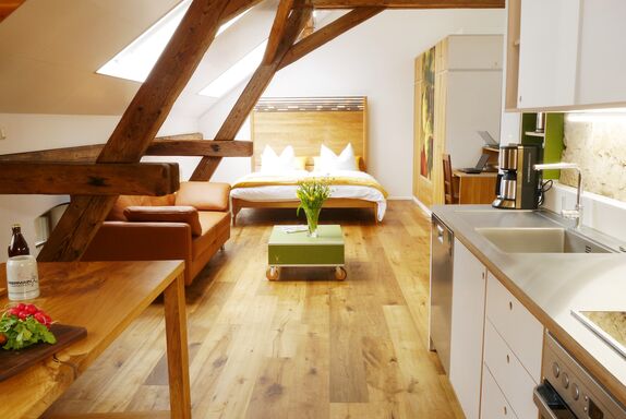 Großzügiges und trotzdem kuscheliges Wohnen für Zwei auf 55 qm. Ausstattung vom Schreiner: Parkettboden aus fränkischer Eiche. Exquisit bestückte, moderne Küche und Designer-Eßtisch. Daran angrenzende Kuschel-Ecke mit Echtleder-Schlafsofa und großem TV-Flatscreen. Offener Schlafraum mit Eichenfrau-Naturholzbett 180x200 cm und Bettwäsche in Überlänge. Tageslichtdurchflutetes, großes Badezimmer in der ehemaligen Darre des Brauhauses, mit begehbarer Regen-Dusche, WC und Bidet. Mit Klimaanlage. Eigene Infrarotsauna im Apartment!