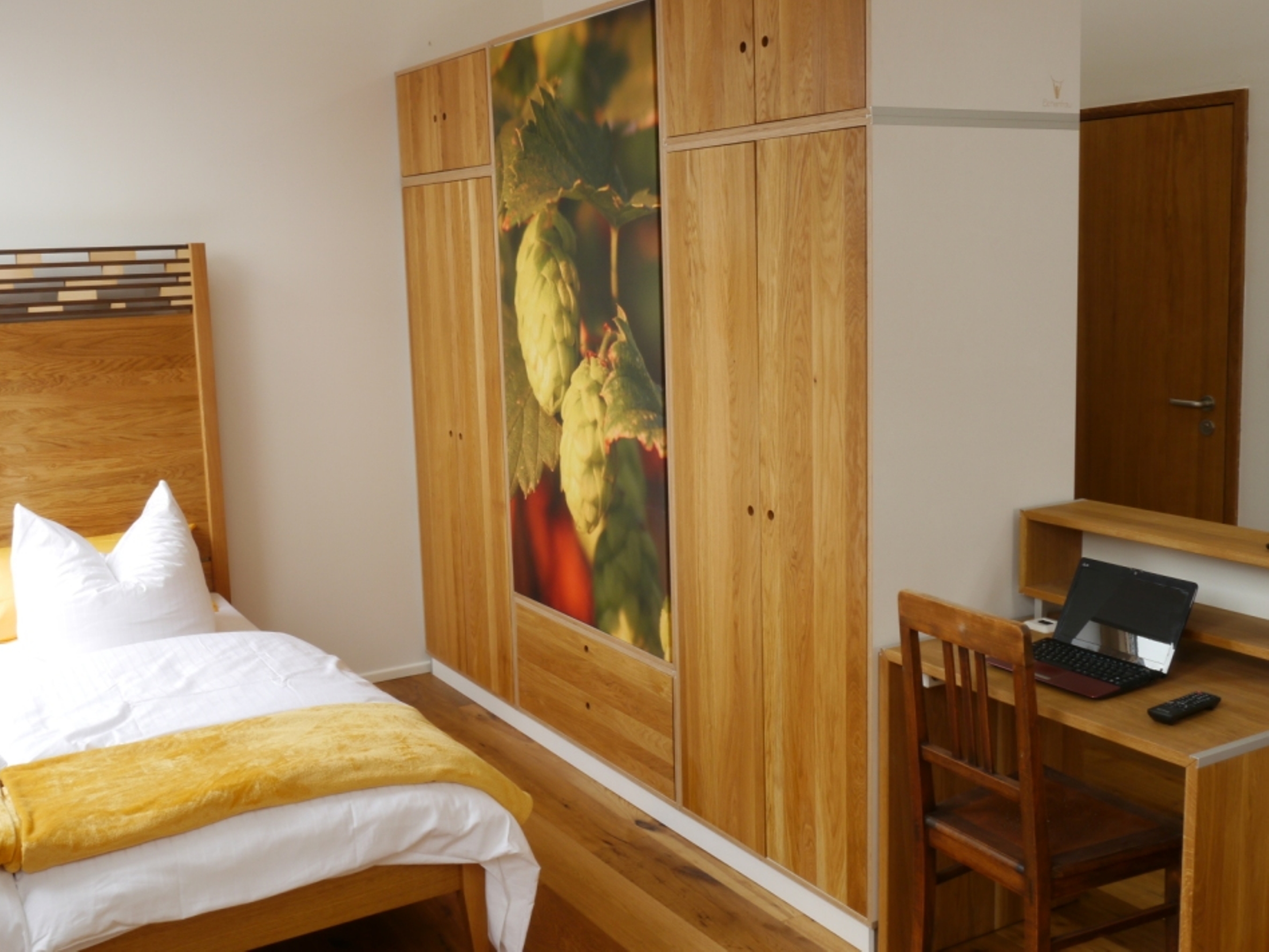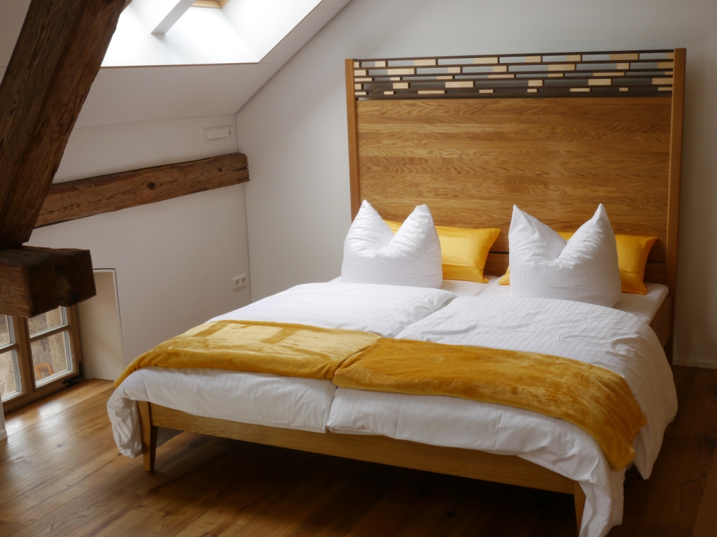 Ganz ruhig und mitten im Naturpark Haßberge, direkt am historischen Rennweg gelegenes, früheres Brauhaus unter Denkmalschutz. Die drei neu ausgebauten, exklusiven Wohnungen und das Doppelzimmer verwöhnen mit vielen Extras zum wohnen und relaxen. Die Einrichtung kommt maßgeschneidert aus der eigenen Schreinerei in natürlichen, edelsten Materialien und Möbeln der Marke Eichenfrau. Nachhaltigkeit, Ökologie und Made-in-Germany werden hier groß geschrieben. Wohlfühlambiente ist somit garantiert. Schöner Garten hinter dem Brauhaus mit maximaler Privatsphäre und Schwimmteich-Biotop. Nur für Erwachsene, keine Haustiere. Freu Dich auf: FEWO Quelle: Liebst Du Ruhe und modernen Komfort, natürliche Oberflächen, großzügiges Wohngefühl? Schätzt Du den direkten Kontakt mit frischer Luft und die freie Sicht auf unverbaute Natur, viel Platz für Dich alleine auch auf der Terrasse? Du magst auch Deinen eigenen Whirlpool mit niemandem teilen - ausser mit deinem Lieblingsmenschen? Egal ob Du gut zu Fuß bist oder nicht, das großzügige und barrierefreie Ambiente der QUELLE wird Dich begeistern. - Apartment Malz: Hier hast Du einen großen Balkon zum Sonnenaufgang und mit weitem Blick in den Garten mit Naturteich, in die grünen fränkischen Hügel, Wälder und Felder. Wenn Du Deine Privatsphäre schätzt und das sonnige Frühstück im Freien mit Vogelgezwitscher nicht missen möchtest, wirst Du Dich hier wohl fühlen und wunderbar erholen.- Apartment Hopfen: Genau richtig bist Du hier, wenn Du tagsüber viel draußen im fränkischen Land unterwegs bist und den Tag gerne gemütlich beginnen und ausklingen lassen möchtest. Oder wenn Du ganz einfach das Gefühl von natürlichen, gewachsenen Materialien unter den Händen liebst und staunend in der ehemaligen Darre unter der großes Regendusche stehen möchtest. Oder Du die wohlige Wärme auf der Haut spüren willst, in Deiner eigenen Infrarotsauna. Willkommen! - Doppelzimmer Gerste: Genau zwischen Hopfen und Malz liegend, kannst Du es dazu buchen. Für eine 3. oder 4. Person oder wenn jeder von Euch sein eigenes Zimmer zum schlafen braucht. Unser Beitrag zum Thema Nachhaltigkeit: Made in Germany, für uns als Schreinerfamilie eine Lebenseinstellung. Die Möbel sind - wo immer möglich - aus heimischen Hölzern und Naturmaterialien von uns selbst entworfen und hergestellt. Kunststoffe versuchen wir so gut es geht zu vermeiden. Auch die allgemeine Ausstattung der Wohnungen ist aus regionaler oder deutscher Produktion mit hohem Qualitätsanspruch und langer Haltbarkeit. Ja, es gibt im Brauhaus 3 auch Klimaanlagen in allen drei Wohnungen! Es klingt wie ein Widerspruch, ist es aber nicht. Denn zu jenen Zeiten, in denen die Klimaanlage gebraucht wird, haben wir ganz viel fränkische Sonne und... unsere Photovoltaikanlagen liefern dann mehr als genug Strom direkt dafür! Wir produzieren und speichern hier rund ums Jahr inzwischen fast doppelt so viel Strom wie wir selbst verbrauchen. Natürlich gibt es noch viel mehr, was wir bereits tun. Dies können Sie auf unserer Website nachlesen: /nachhaltigkeit/