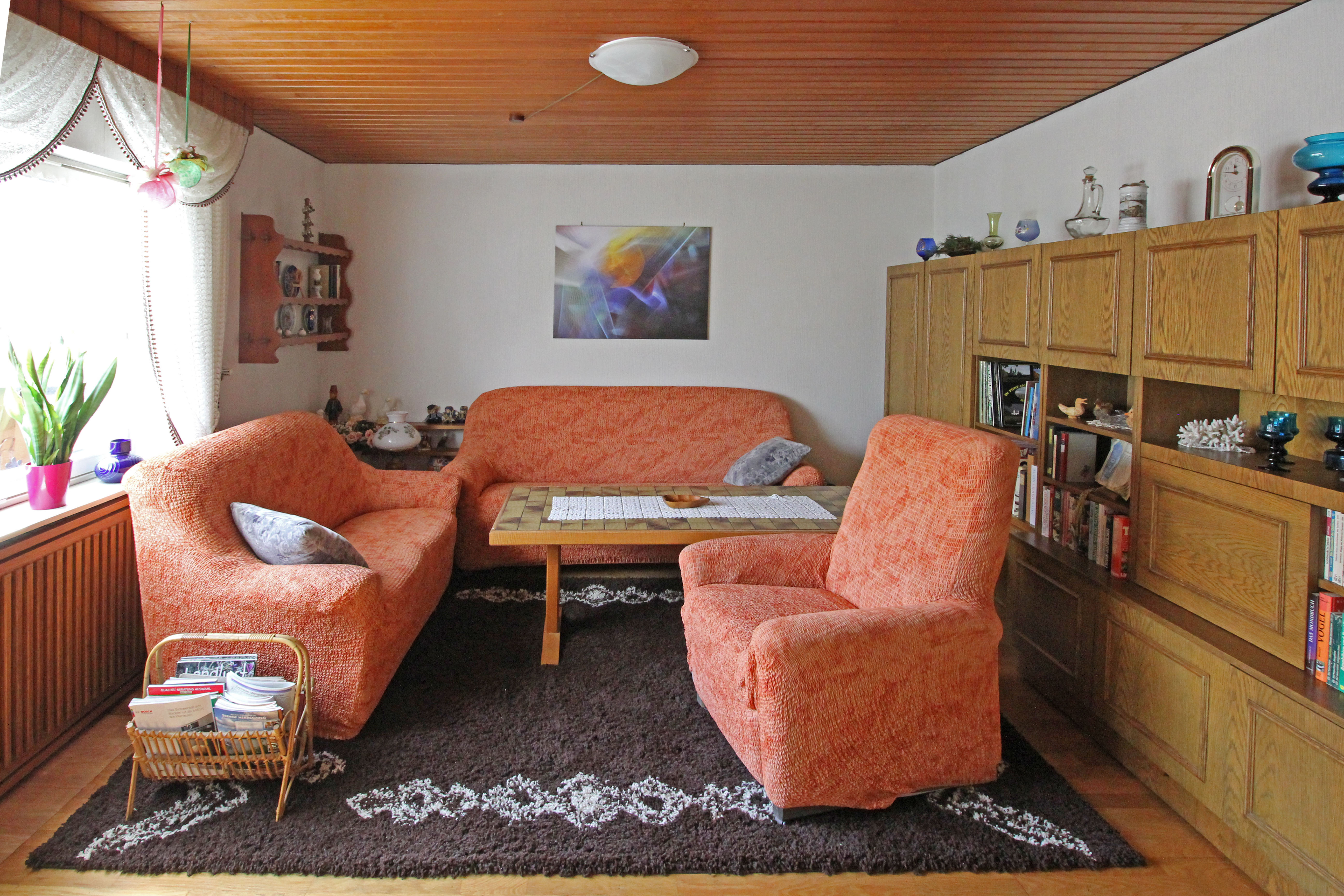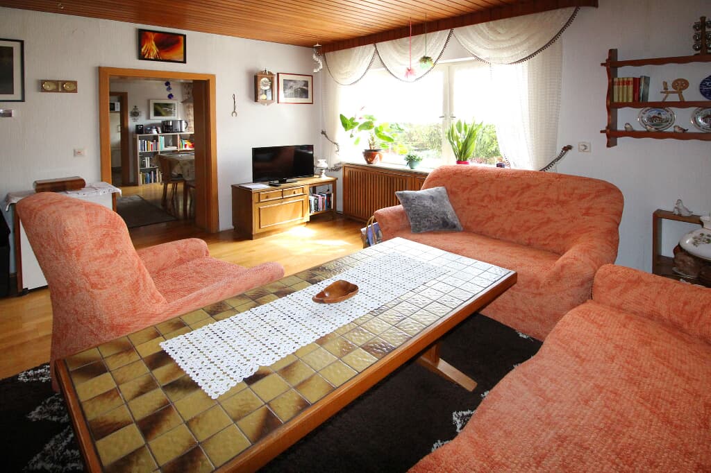 Geräumiges Wohnzimmer mit 2 Sofas, verstellbarem Sessel und Kabel-TV sowie Radio mit CD-Player, Plattenspieler und Kassettendeck.