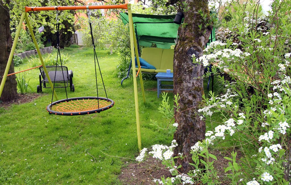 Garten mit Bank und Tisch sowie Kinderschaukel und überdachter Freisitz mit Gartenmöbel können mit benützt werden. Es besteht auch Möglichkeit zum Grillen.