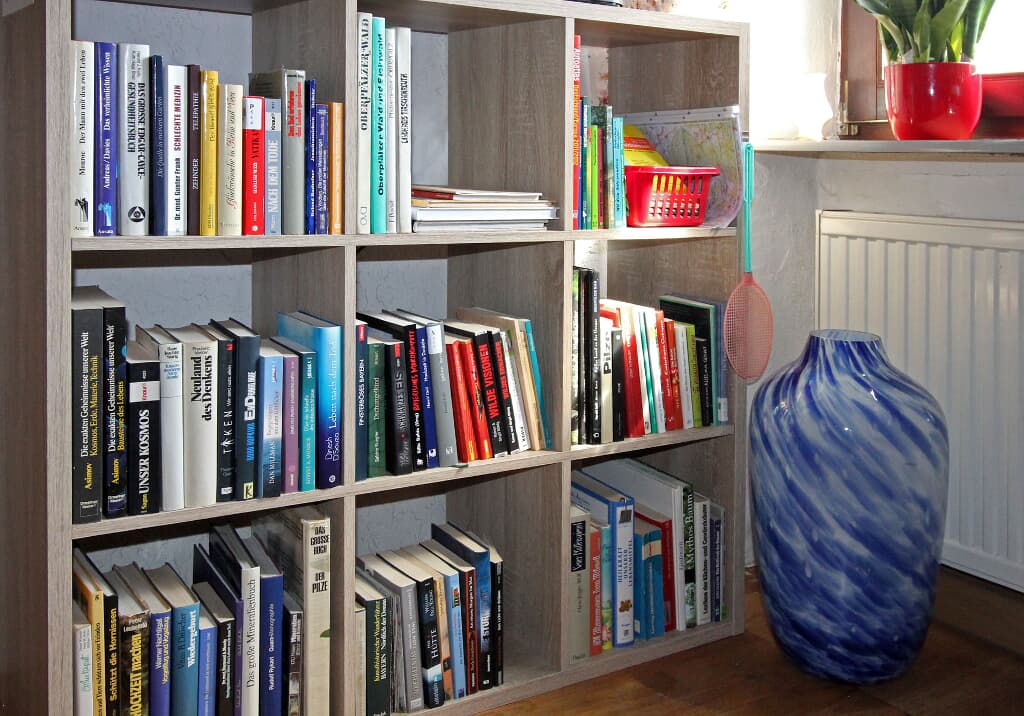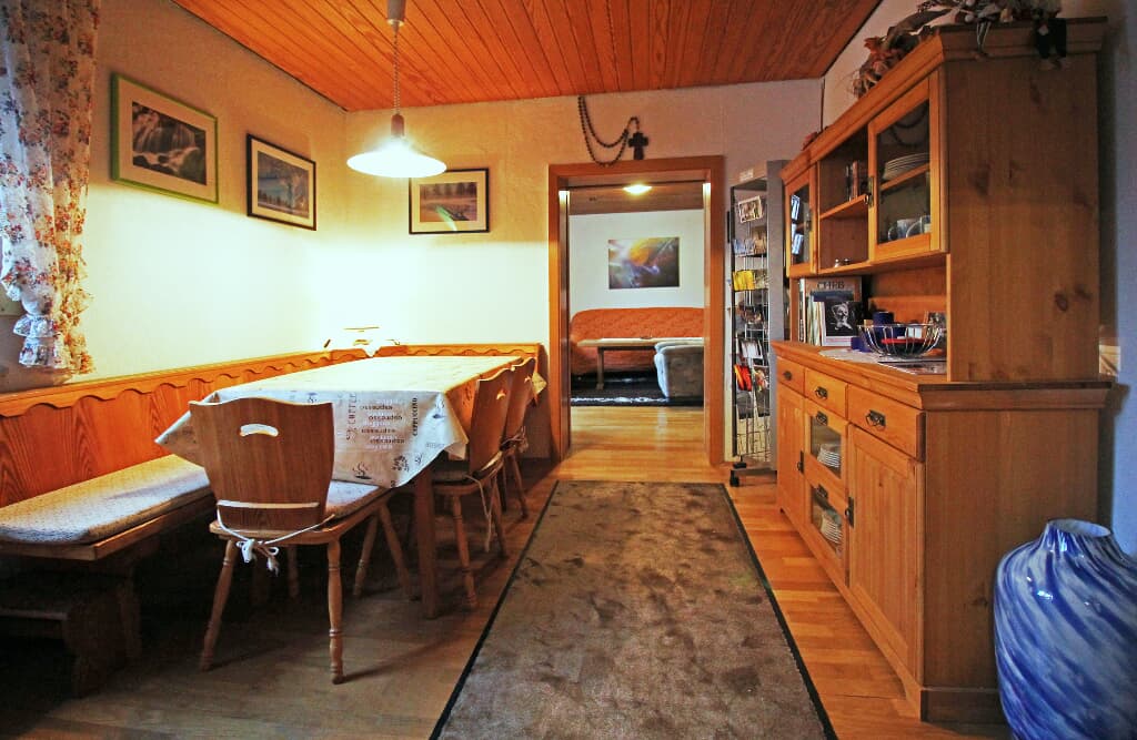 Esszimmer mit Eckbank, Bücherschrank und Leseecke. Kaffeemaschine mit Wasserkocher und Toaster