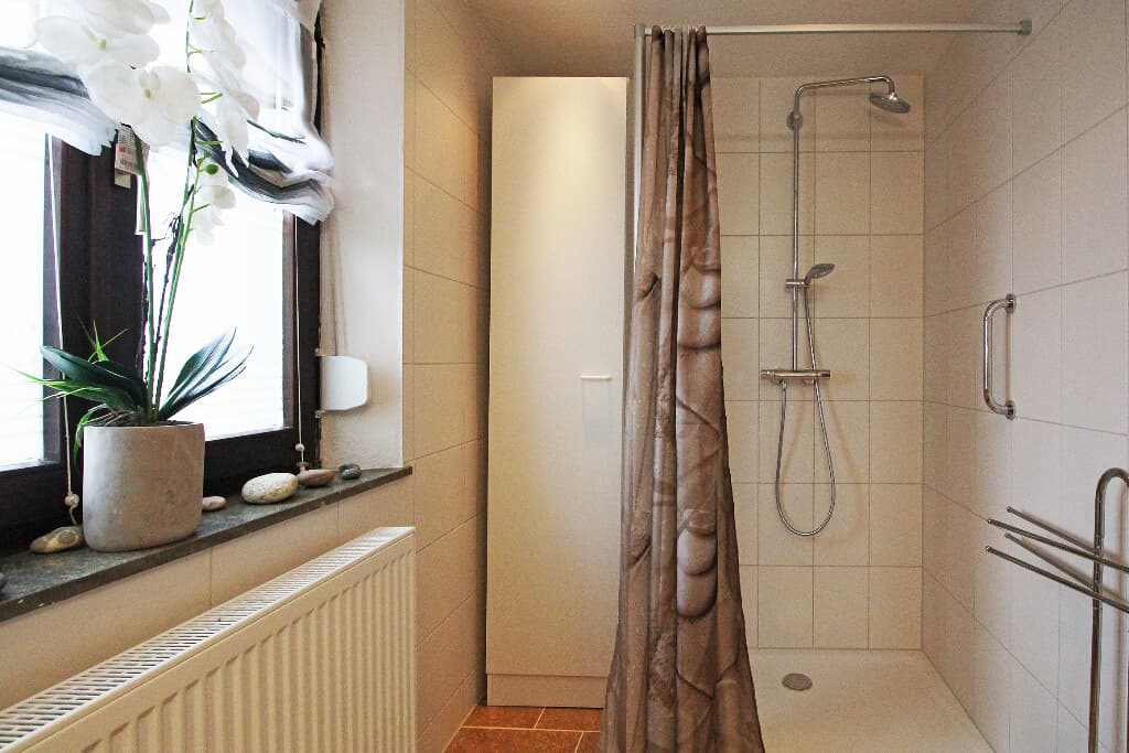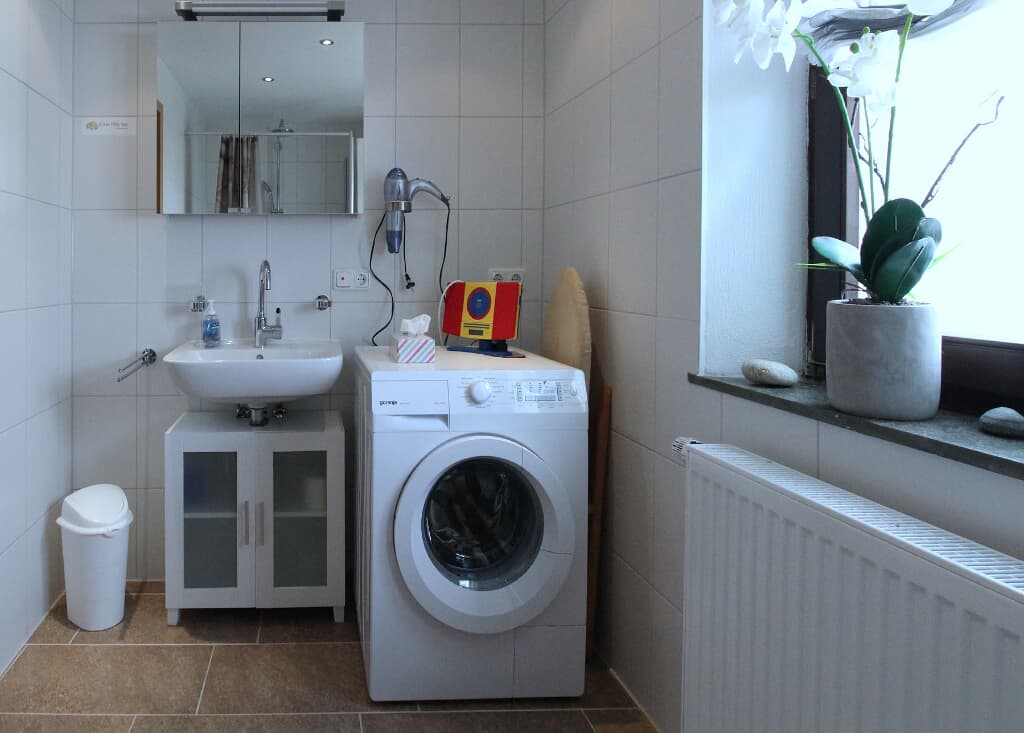 Duschraum mit Großraumdusche und bodenebenen, rutschfesten Einstieg, Spiegel, Duschstuhl sowie Föhn und Waschmaschine, Wäscheständer, Radio, Bügeleisen, Bügelbrett und Erste Hilfe-Set.