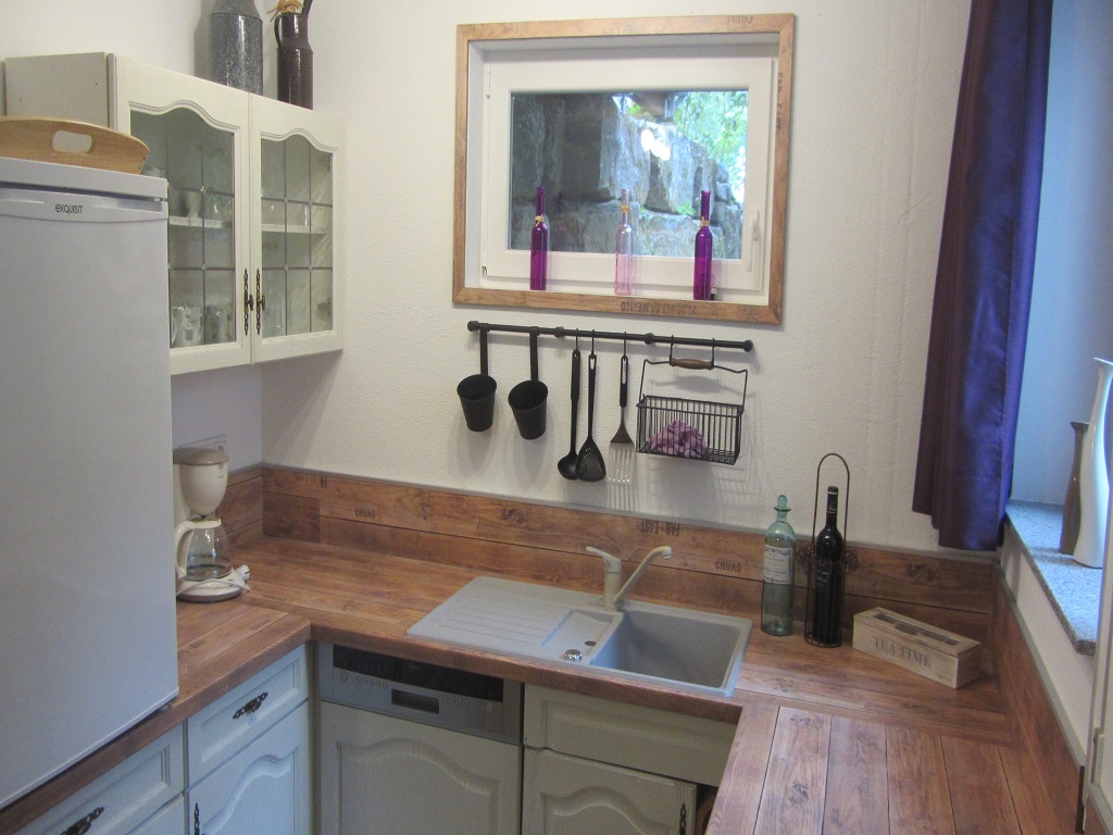 Unsere Wohnküche mit Essbereich ist voll ausgestattet. Sie verfügt über einen Kühlschrank mit Gefrierfach, vier Herdplatten, Backofen, Kaffeemaschine, Toaster, Eierkocher und Radio. Hier macht kochen Freude. Den Abwasch erledigt anschließend unsere Spülmaschine.