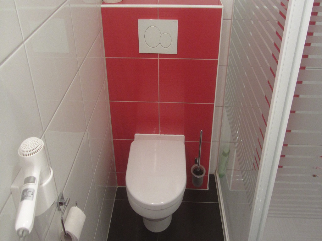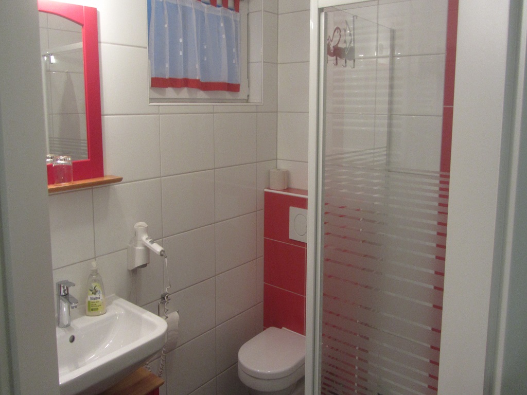 Unser Badezimmer verfügt über eine Dusche mit niedriger Einstiegshöhe, Waschbecken und WC. Handtücher sowie ein Fön stehen für unsere Gäste zur Verfügung.