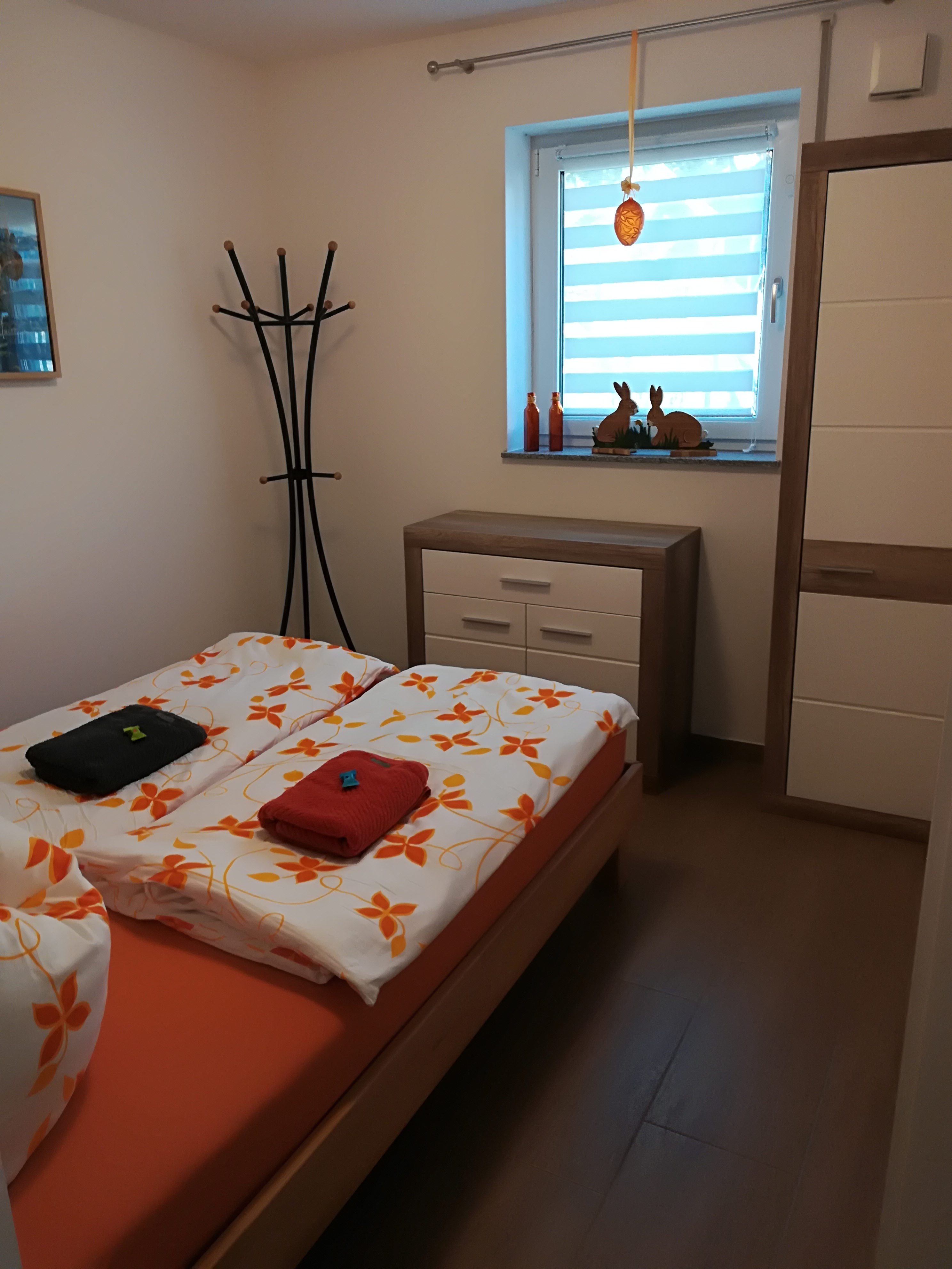 Das Schlafzimmer ist mit einem Doppelbett (Liegefläche 140 cm x 200 cm), Kleiderschrank, Spiegel, Kommode und Kleiderständer eingerichtet.