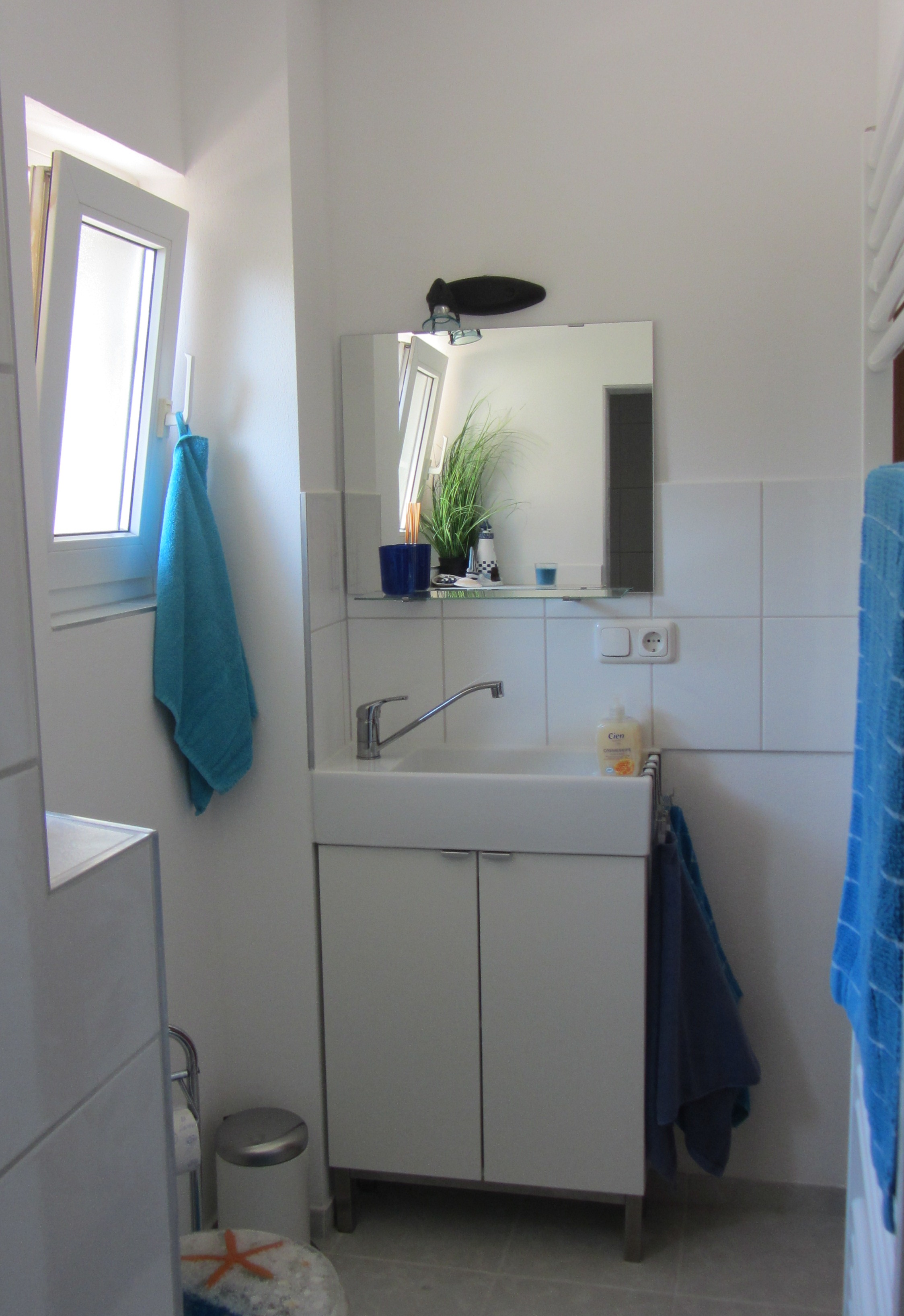 - ein Bad mit Dusche, Waschbecken und WC, Fön