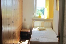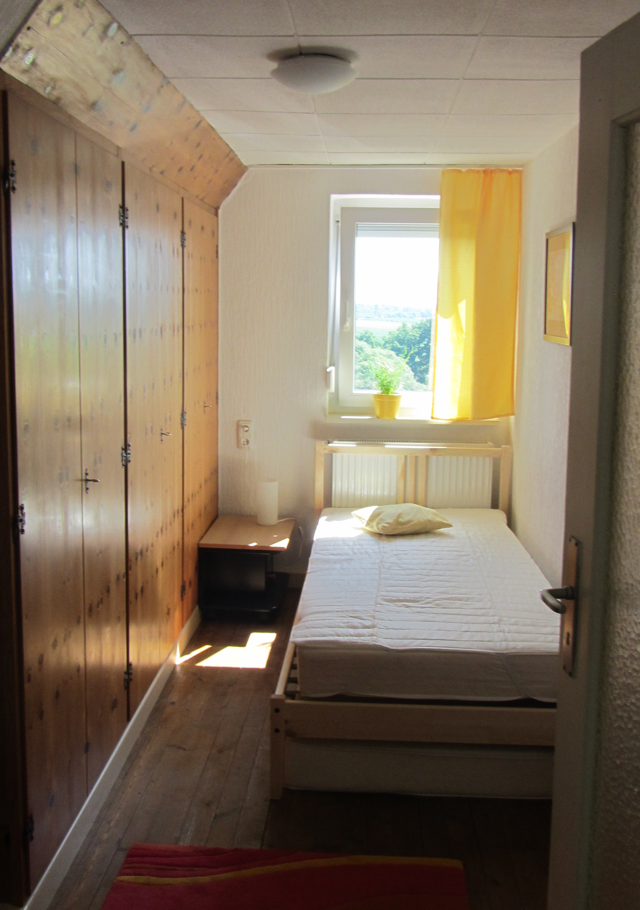 - ein Schlafzimmer mit Einzelbett mit Nachttisch und Lampe, einer Wäschekommode sowie einen Kleiderschrank und Spiegel