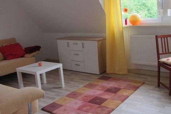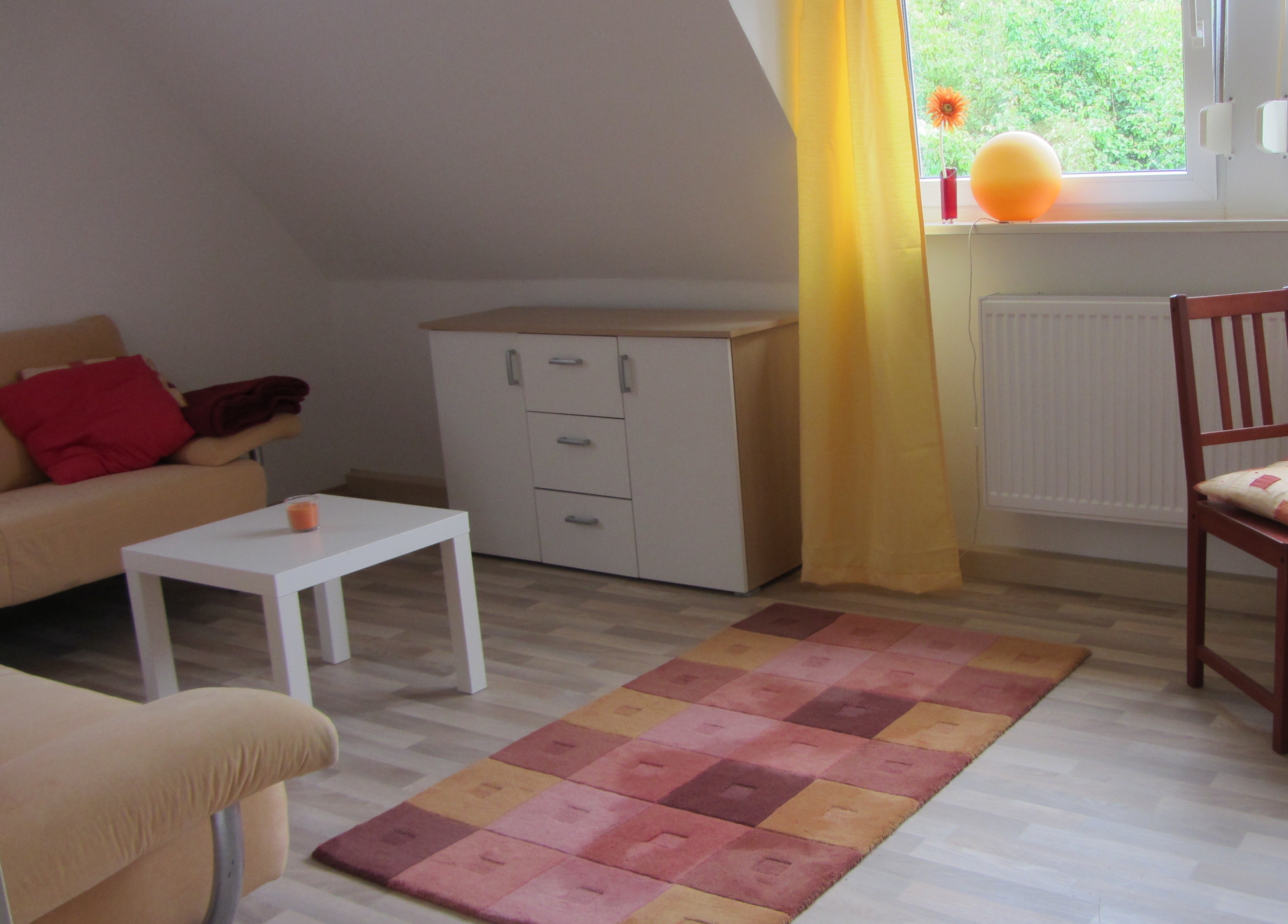 - ein Wohnzimmer mit 2 Sofas, Sat-TV, einen kleinen Tisch und ein Bücherregal mit Lektüre über Schweinfurt und Umgebung, sowie ein kleine Auswahl an Tischspielen.