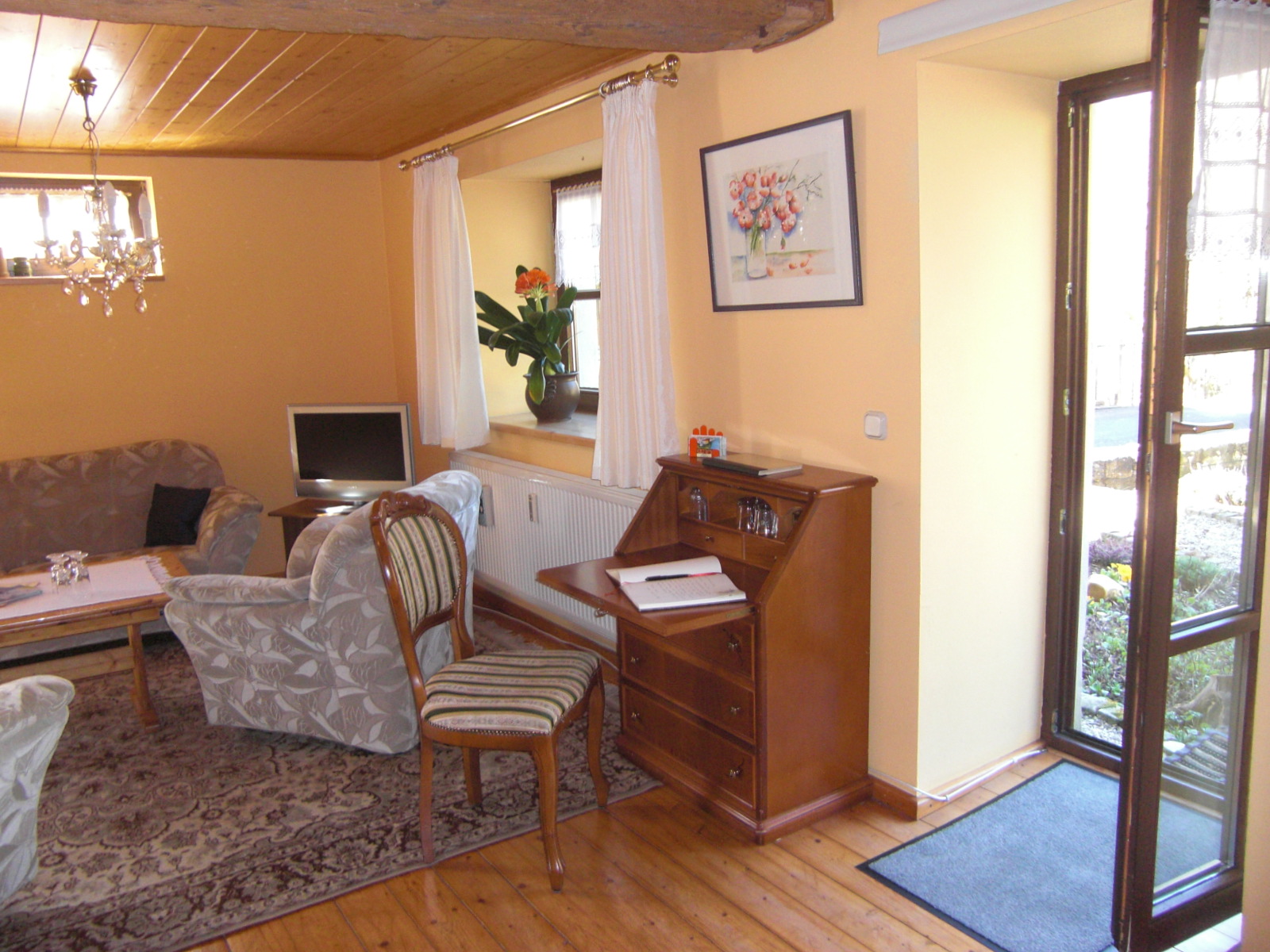 Unsere 63 m² große Ferienwohnung besteht aus einem großen, gemütlichen Wohn-Schlafraum (TV, CD, Doppelbett und Einzelbett, Essecke, große Sitzgruppe, Terrassenzugang), Küche (Kaffeemaschine, Toaster, Wasserkocher, Kühlschrank/Gefrierfach, Herd, sowie WC und/Dusche. Die Wohnung ist ideal für bis zu 3 Personen.