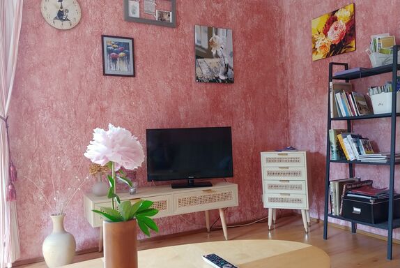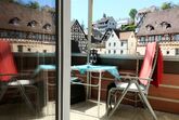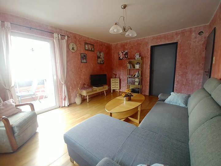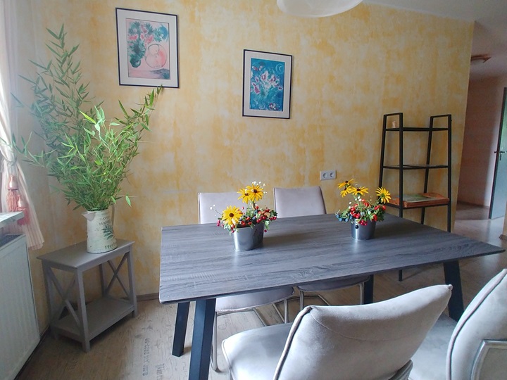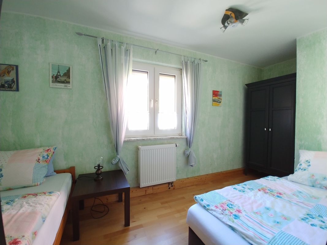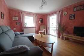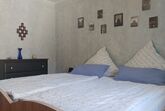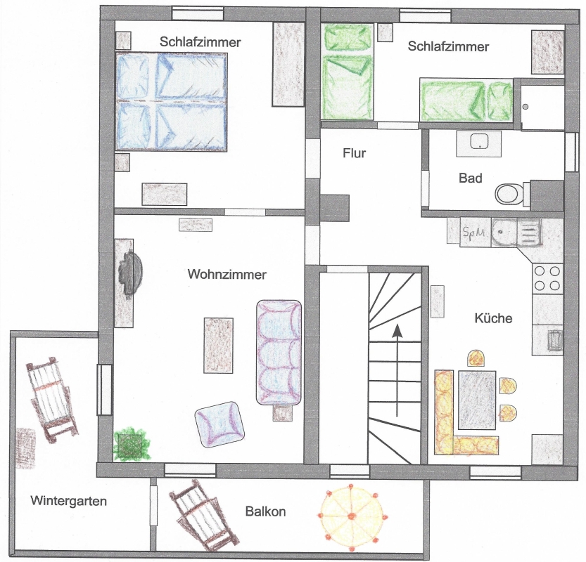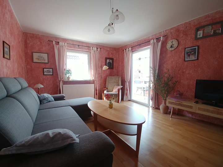 Unsere geräumige Wohnung im ersten Stock ist 65qm groß. Sie verfügt über ein Wohnzimmer mit Sessel und Sofa, Sat-TV, Radio, einem Couchtisch und einem Bücherregal mit Lektüre über Schweinfurt und Umgebung. In diesem Raum befindet sich auch der Zugang auf den zum Teil überdachten und verglasten Balkon. Außerdem befinden sich zwei Schlafzimmer in der Wohnung. Das erste Schlafzimmer verfügt über ein Doppelbett (Betten können auch einzeln gestellt werden) mit Nachttischen und Lampen, Kommode, Kleiderschrank und Spiegel. Das zweite, kleinere Schlafzimmer hat zwei Einzelbetten und eine Kommode. Das Badezimmer ist mit Dusche, Waschbecken, WC und Fön ausgestattet. Eine große vollständig ausgestattete Wohnküche mit großem und gemütlichem Essplatz, Kühlschrank mit Gefrierfach, Spülmaschine, Mikrowelle, Kaffeemaschine, Wasserkocher, Mixer, Toaster sowie ausreichend Geschirr und Besteck sind ebenfalls Bestandteil der Ferienwohnung. Zudem stellen wir unseren Gästen eine Grundausstattung mit Kaffee und Tee, Zucker, Gewürzen sowie Essig und Öl bereit. Hier finden Sie auch Reinigungsmaterial und ein Bügeleisen.