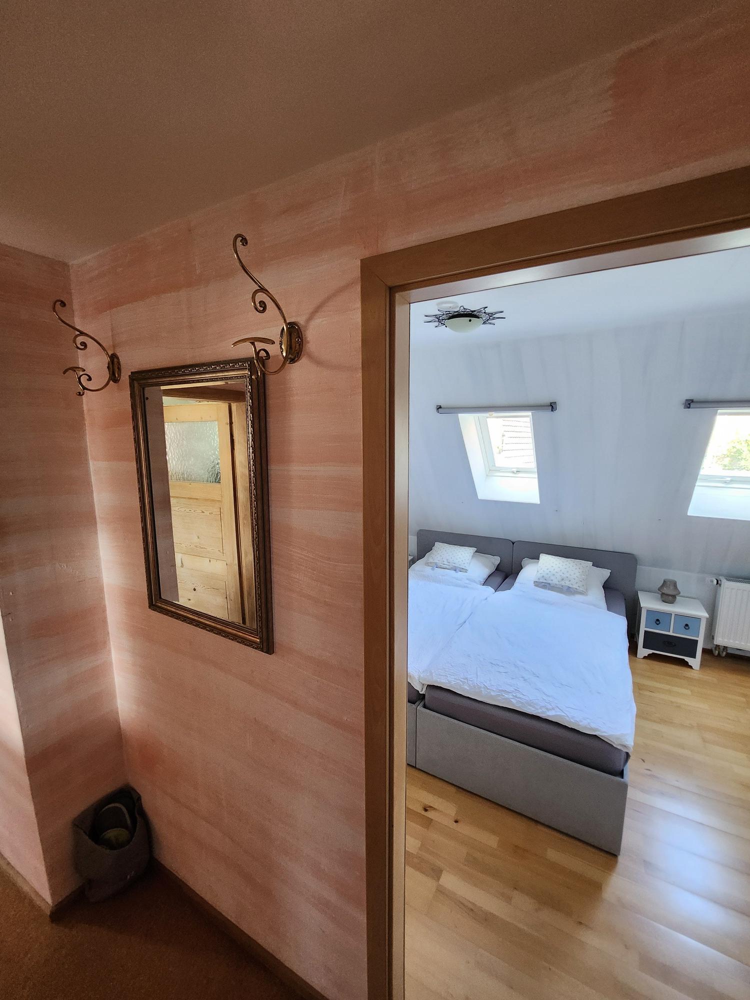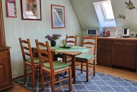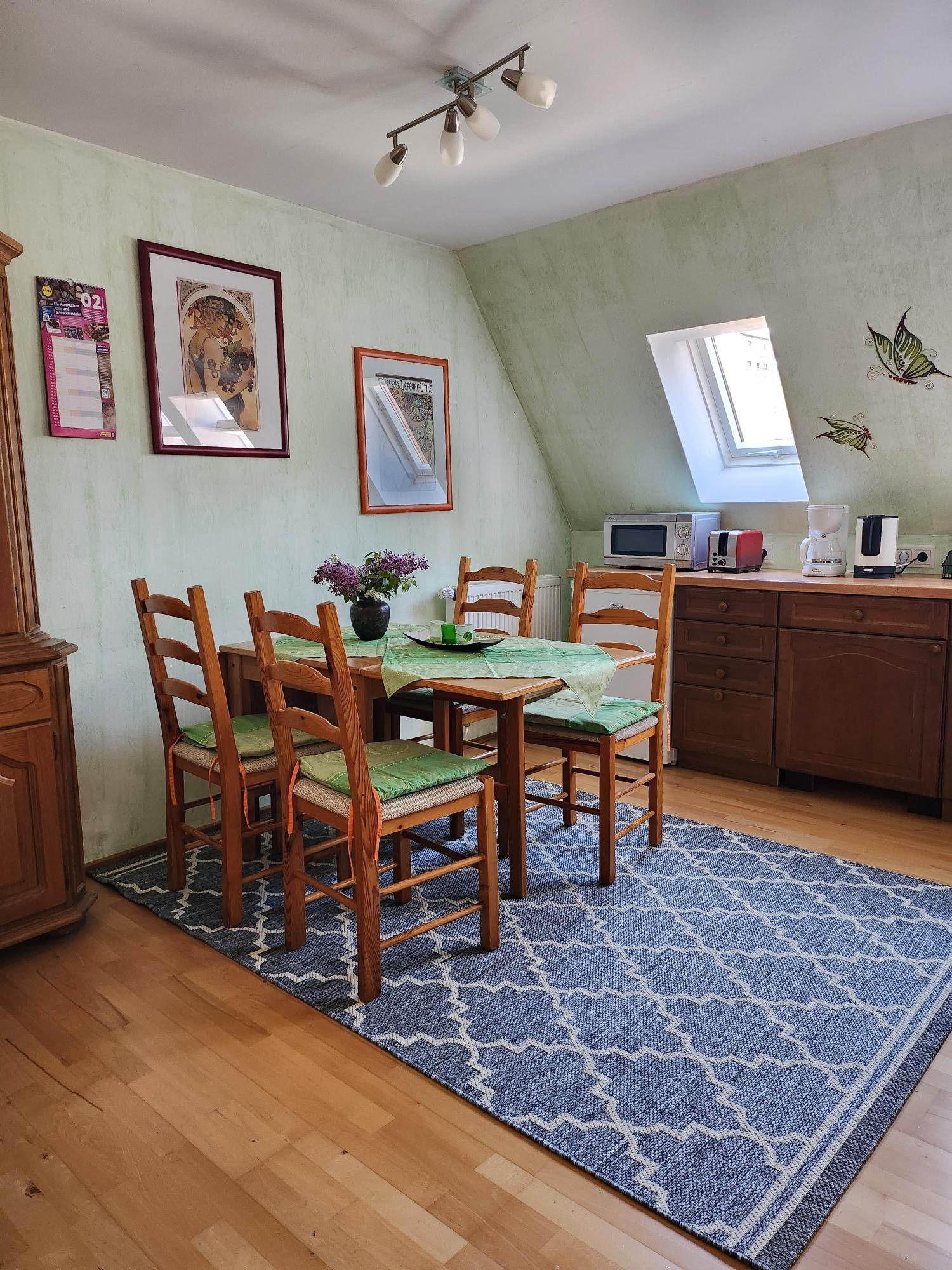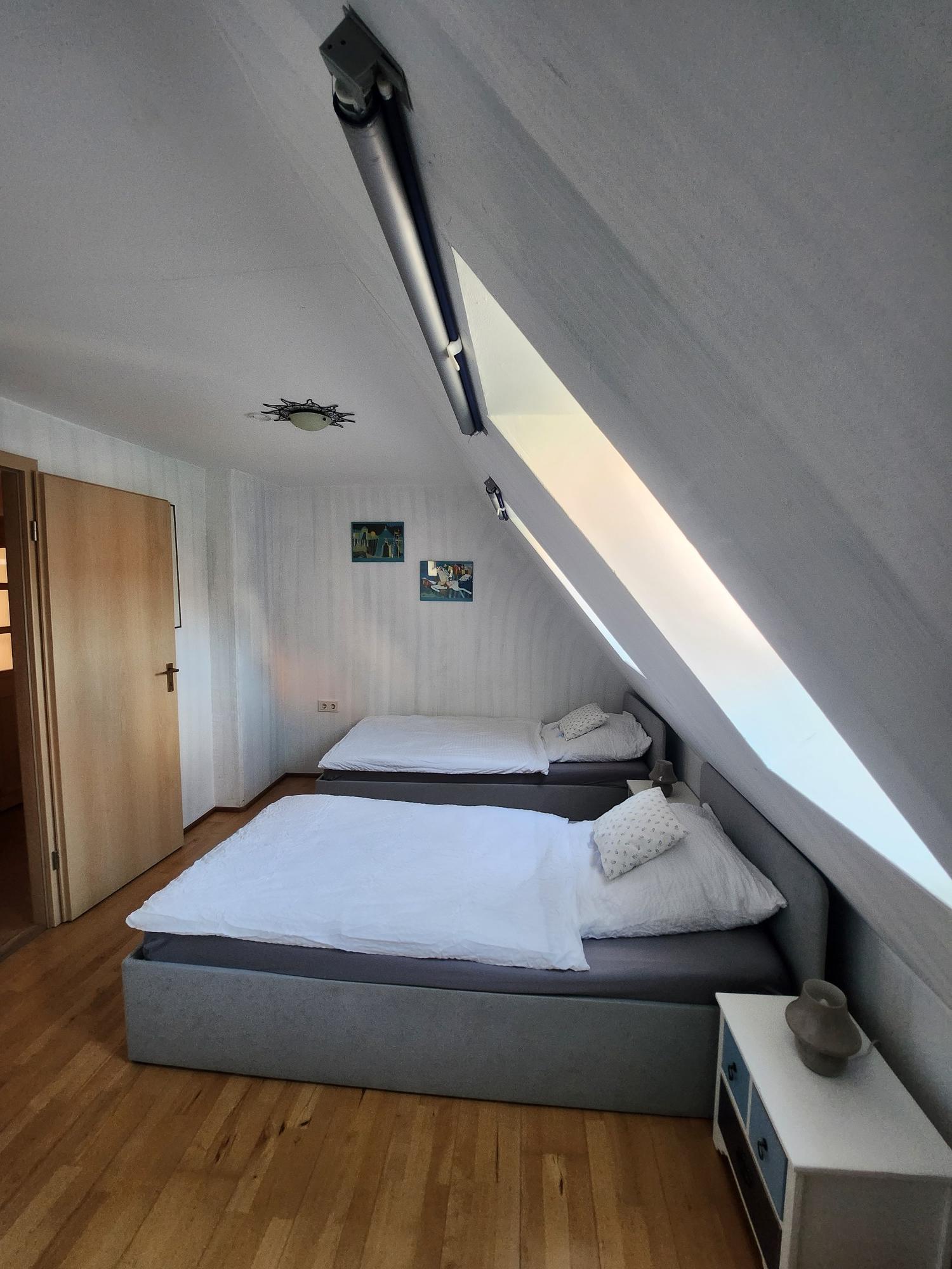 In unserer gemütlichen Mansardenwohnung im Dachgeschoss ist 55m² groß. Sie verfügt über eine große, vollständig ausgestattete Wohnküche mit Mikrowelle, Kaffeemaschine, Kühlschrank mit Gefrierfach, Wasserkocher, Toaster, sowie ausreichend Geschirr und Besteck. Außerdem gibt es einen großen Esstisch. Im linken Teil des Raumes befindet sich der Wohnbereich mit zwei Sesseln und Sofa, Sat-TV, einem kleinen Tisch und einem Bücherregal mit Lektüre über Schweinfurt und Umgebung. Die Wohnung verfügt über zwei Schlafzimmer. Ein Schlafzimmer ist mit zwei Einzelbetten (zusammengeschoben Doppelbett) mit Nachttischen und Lampen bestückt. Das zweite, kleinere Schlafzimmer verfügt über zwei Einzelbetten und eine Kommode. Das Badezimmer ist mit Dusche, Waschbecken, WC und Fön ausgestattet.