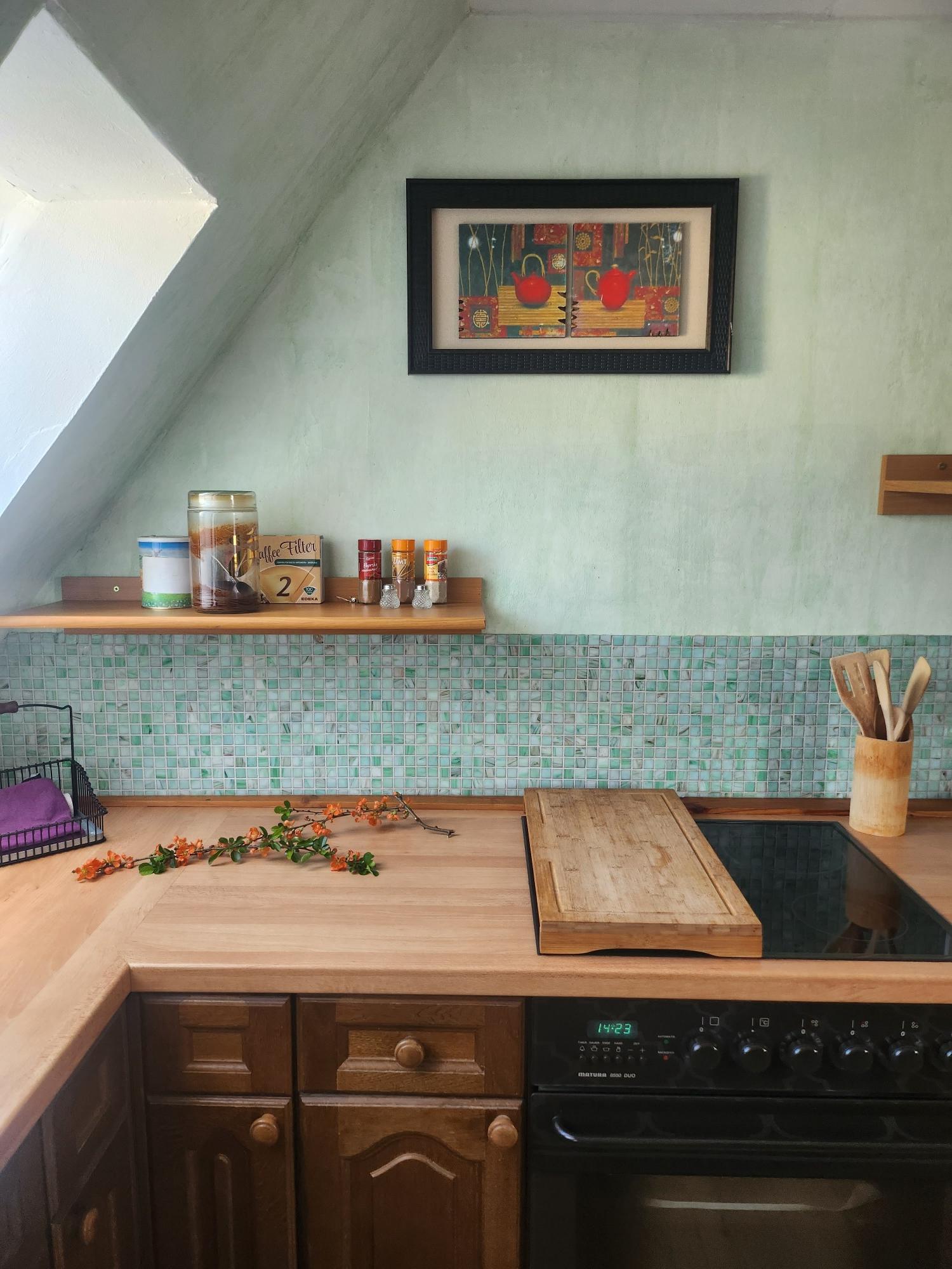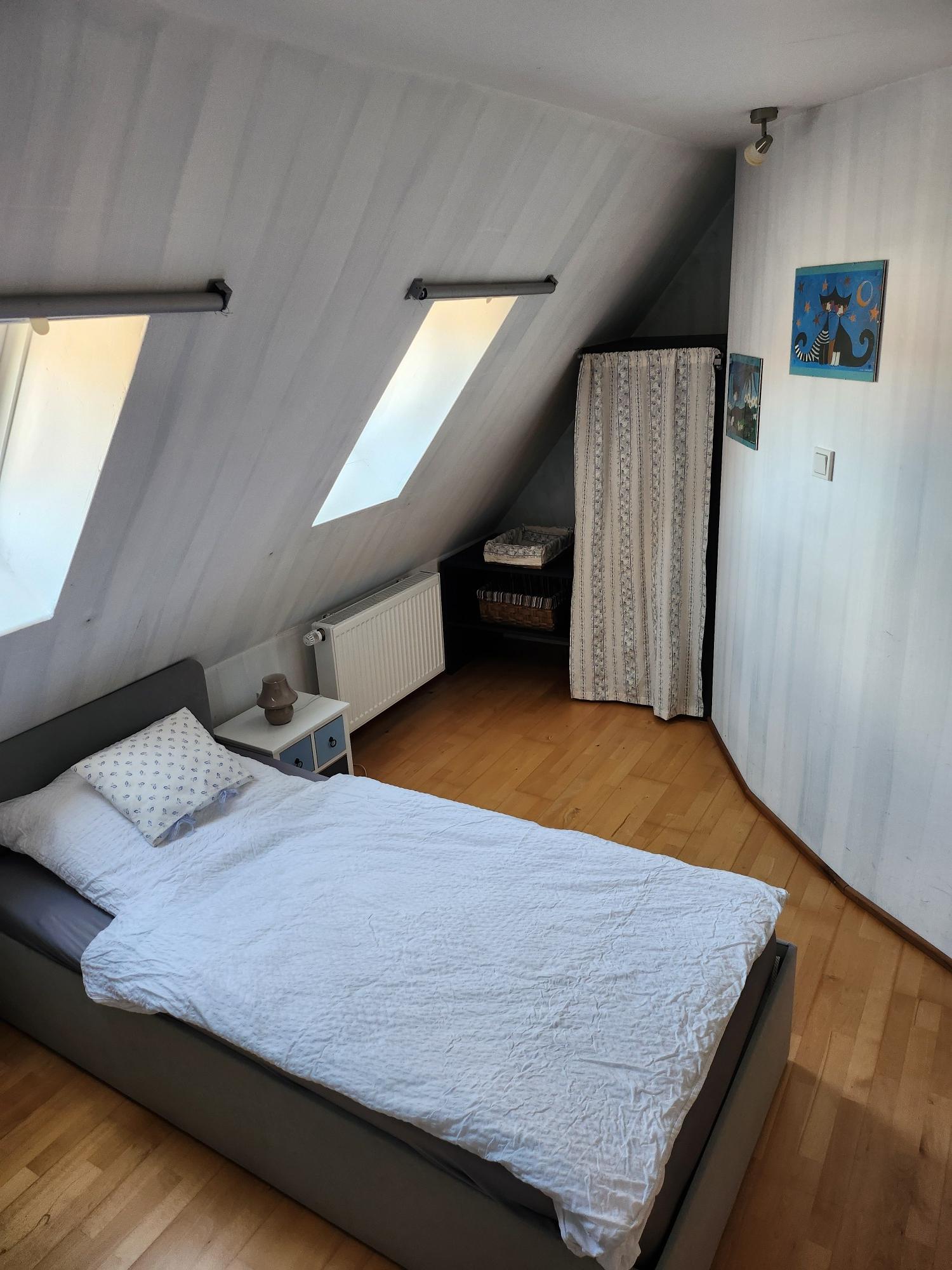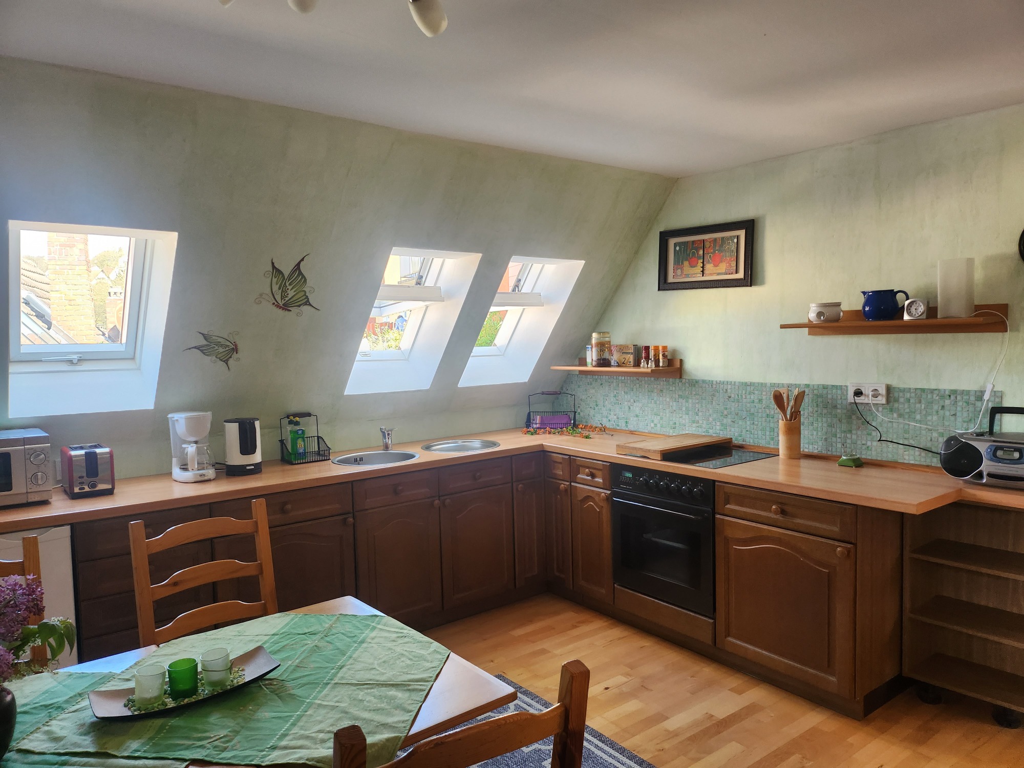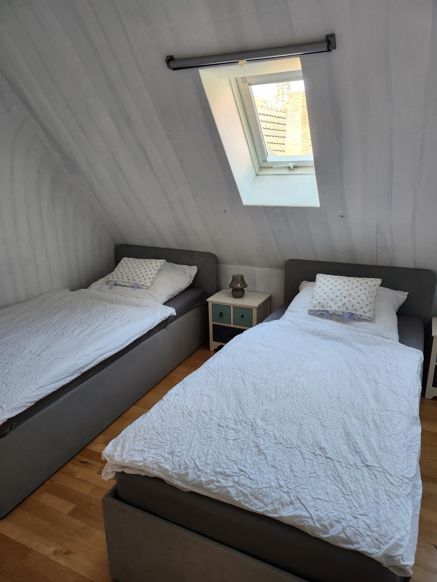 In unserer gemütlichen Mansardenwohnung im Dachgeschoss ist 55m² groß. Sie verfügt über eine große, vollständig ausgestattete Wohnküche mit Mikrowelle, Kaffeemaschine, Kühlschrank mit Gefrierfach, Wasserkocher, Toaster, sowie ausreichend Geschirr und Besteck. Außerdem gibt es einen großen Esstisch. Im linken Teil des Raumes befindet sich der Wohnbereich mit zwei Sesseln und Sofa, Sat-TV, einem kleinen Tisch und einem Bücherregal mit Lektüre über Schweinfurt und Umgebung. Die Wohnung verfügt über zwei Schlafzimmer. Ein Schlafzimmer ist mit zwei Einzelbetten (zusammengeschoben Doppelbett) mit Nachttischen und Lampen bestückt. Das zweite, kleinere Schlafzimmer verfügt über zwei Einzelbetten und eine Kommode. Das Badezimmer ist mit Dusche, Waschbecken, WC und Fön ausgestattet.