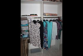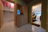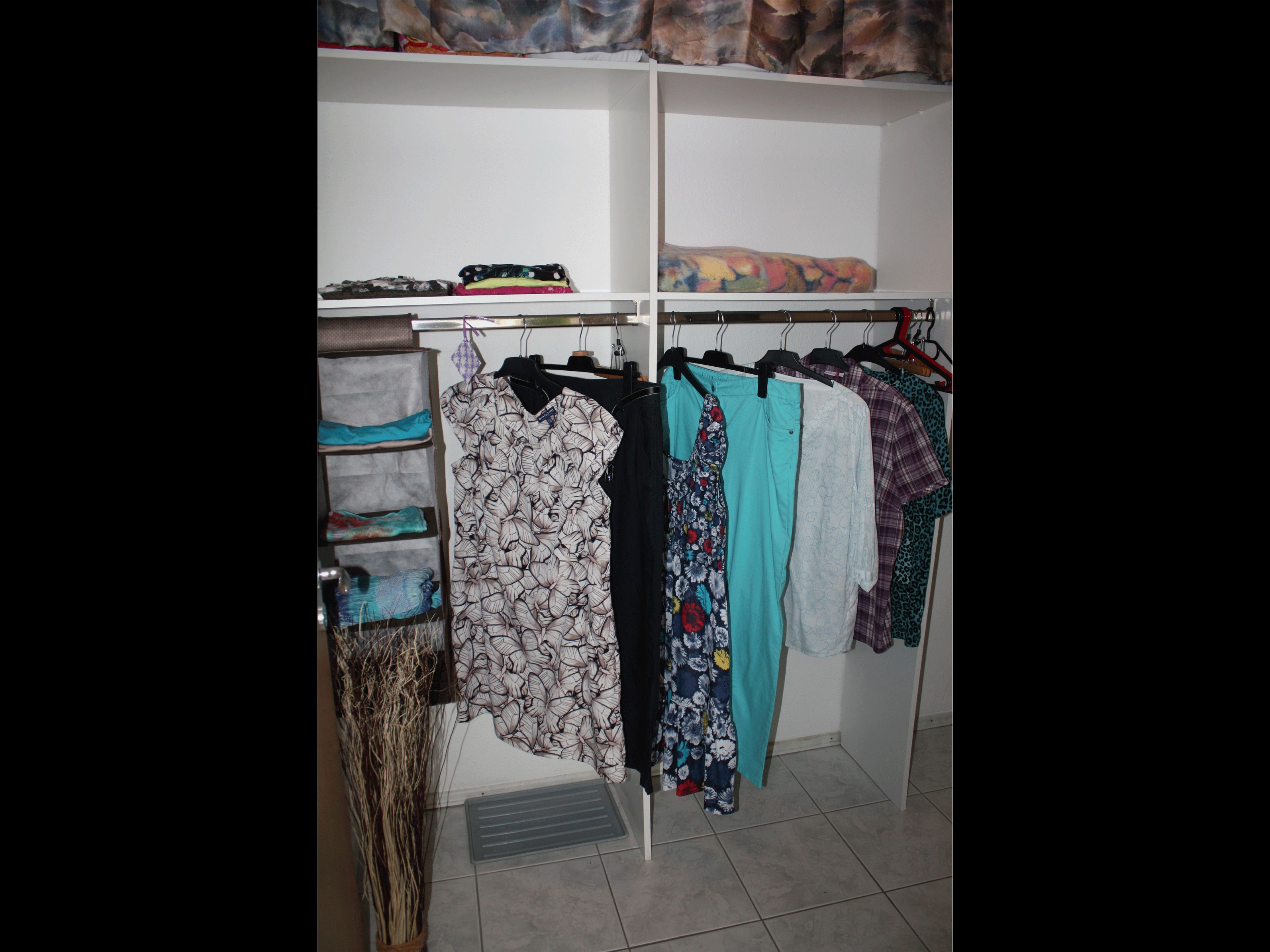 Schräg gegenüber steht ihnen ein begehbarer, geräumiger Kleiderschrank zur Verfügung.