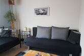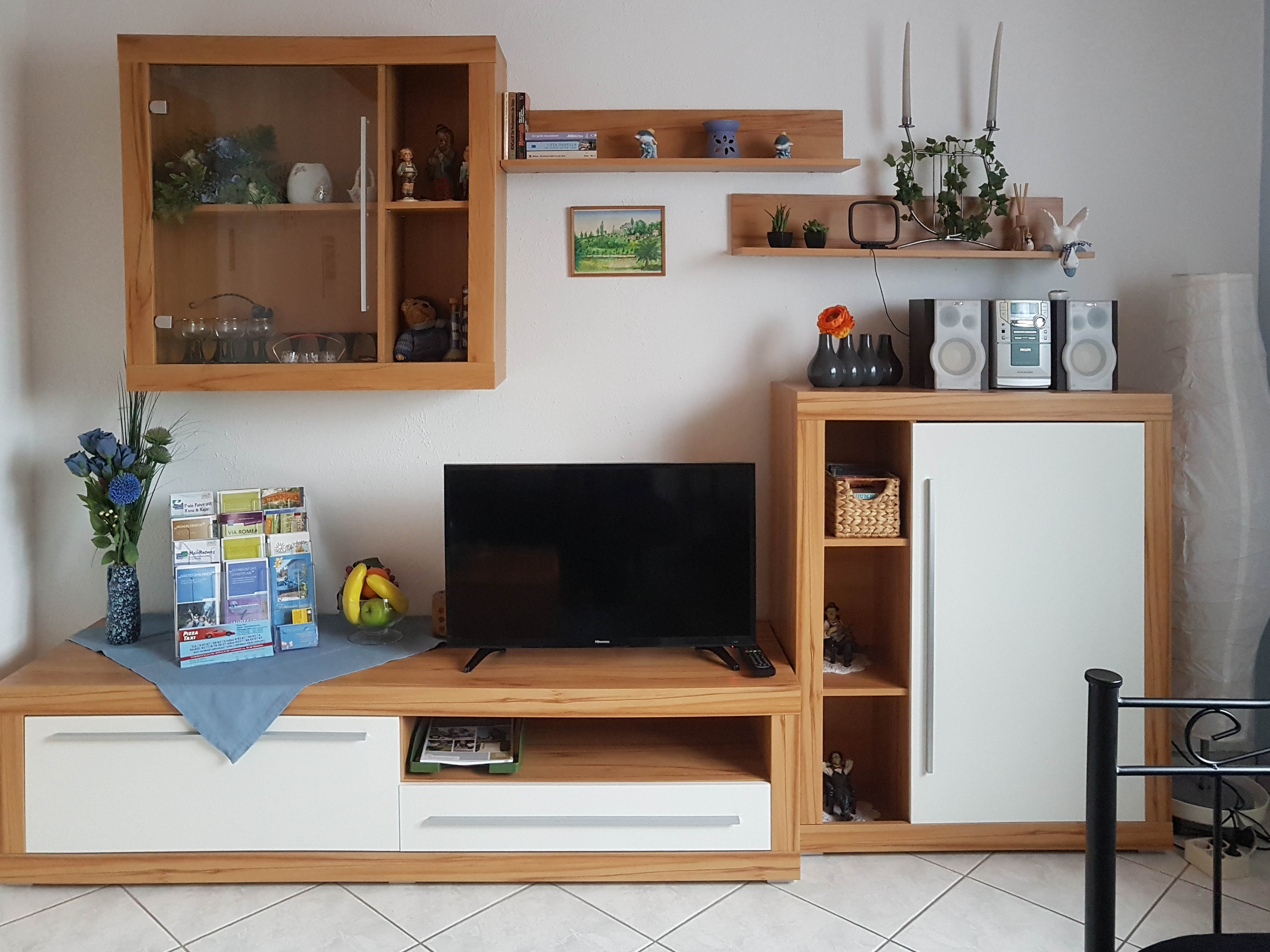 Das gemütliche Wohnzimmer lädt zum verweilen ein. Hier befindet sich ein Sofa und ein bequemes Einzelbett (90x200cm), ein Couchtisch, eine Schrankwand mit TV und Stereoanlage. Hier können Sie Ihren Urlaubstag gemütlich ausklingen lassen. Für die Freizeitplanung liegen Prospekte mit Ausflugsmöglichkeiten bereit.Gerne beraten wir Sie hierzu und geben Ihnen Tips. Ebenso ein paar Bücher und diverse Spiele.