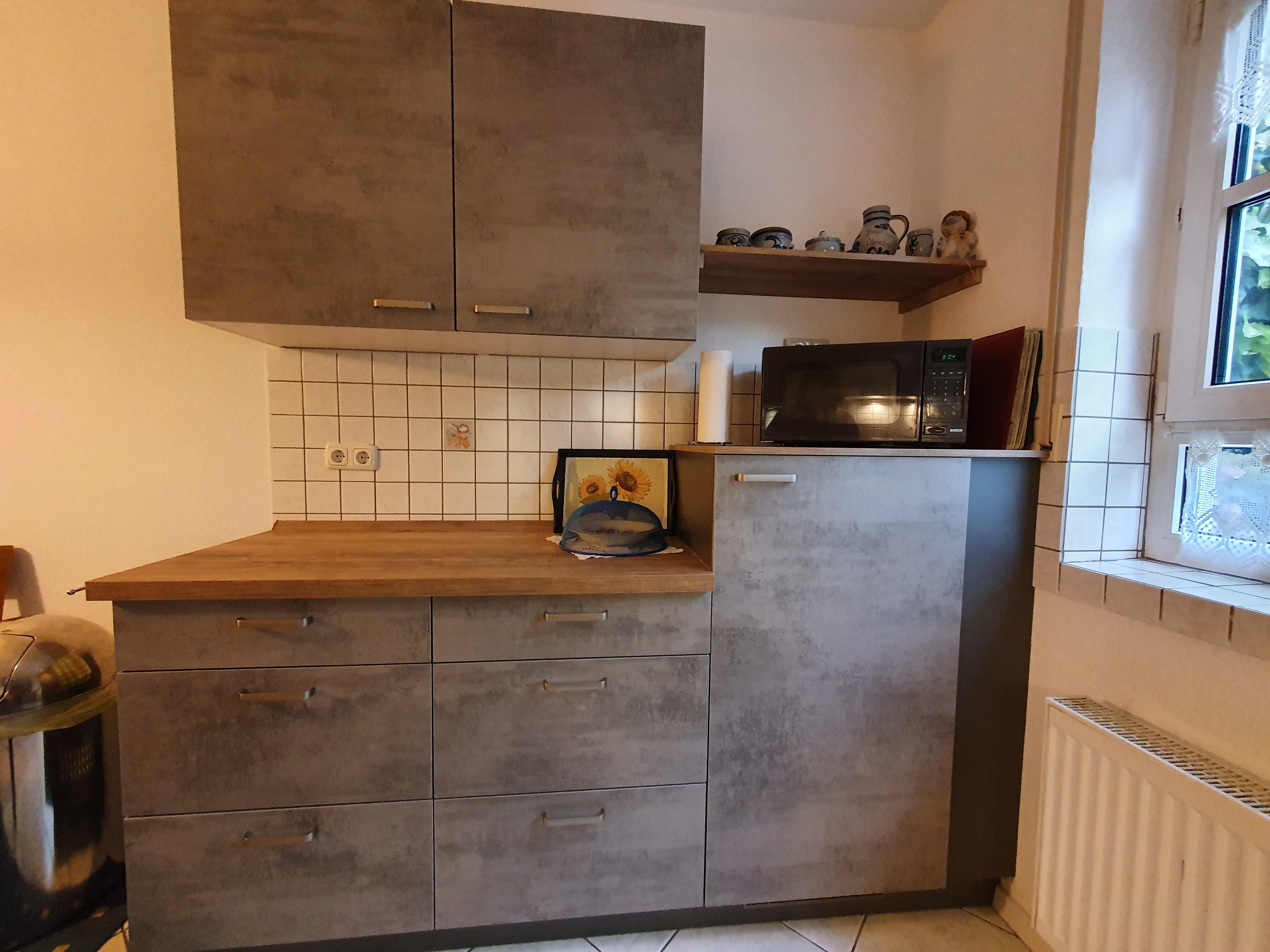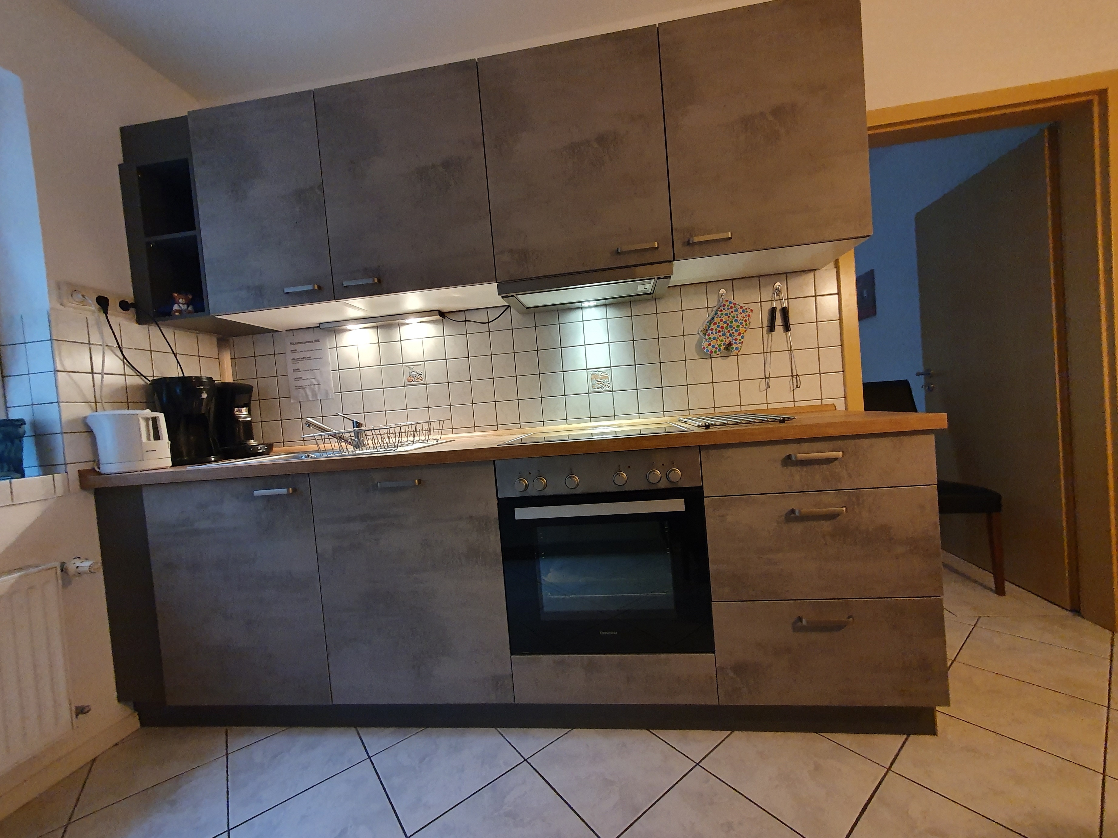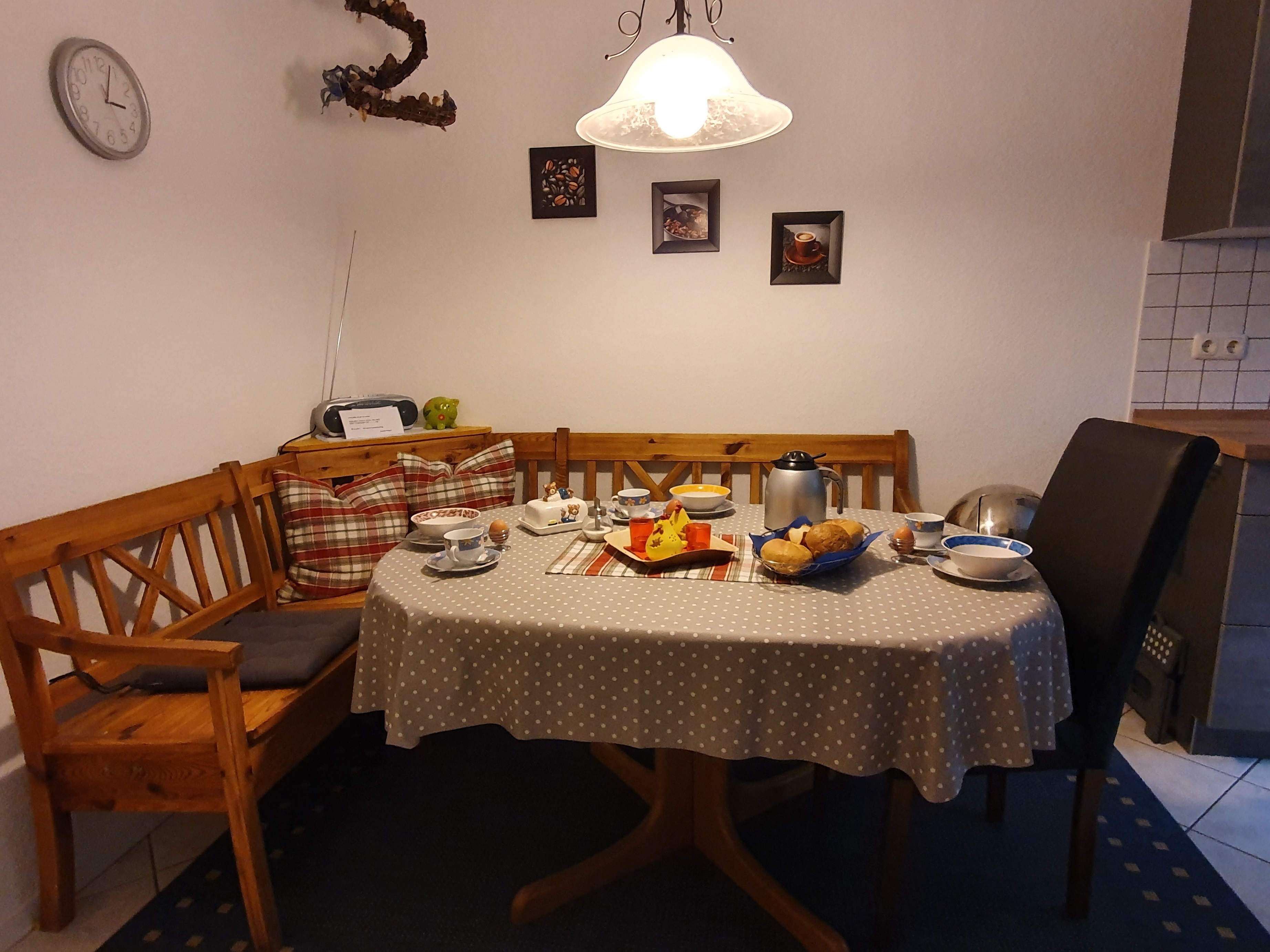 Die geräumige Küche mit großem Esstisch, Eckbank und Stühlen ist gemütlich eingerichtet. Ein Hochstuhl für ein Kleinkind kann gestellt werden.In der Küche befindet sich: Elektroherd mit Backofen, Mikrowelle, Spülmaschine, Kühlschrank mit Gefrierfach, Wasserkocher, Kaffeemaschine, Kaffeepadmaschine, Toaster, Eierkocher, Mixer, Küchenwaage, Kuchenform sowie div. Geschirr ist ebenfalls reichlich vorhanden.In den Schränken ein kleiner Vorrat an Gewürzen usw. In der Küche befindet sich ein Radio. Tischwäsche wird gestellt.