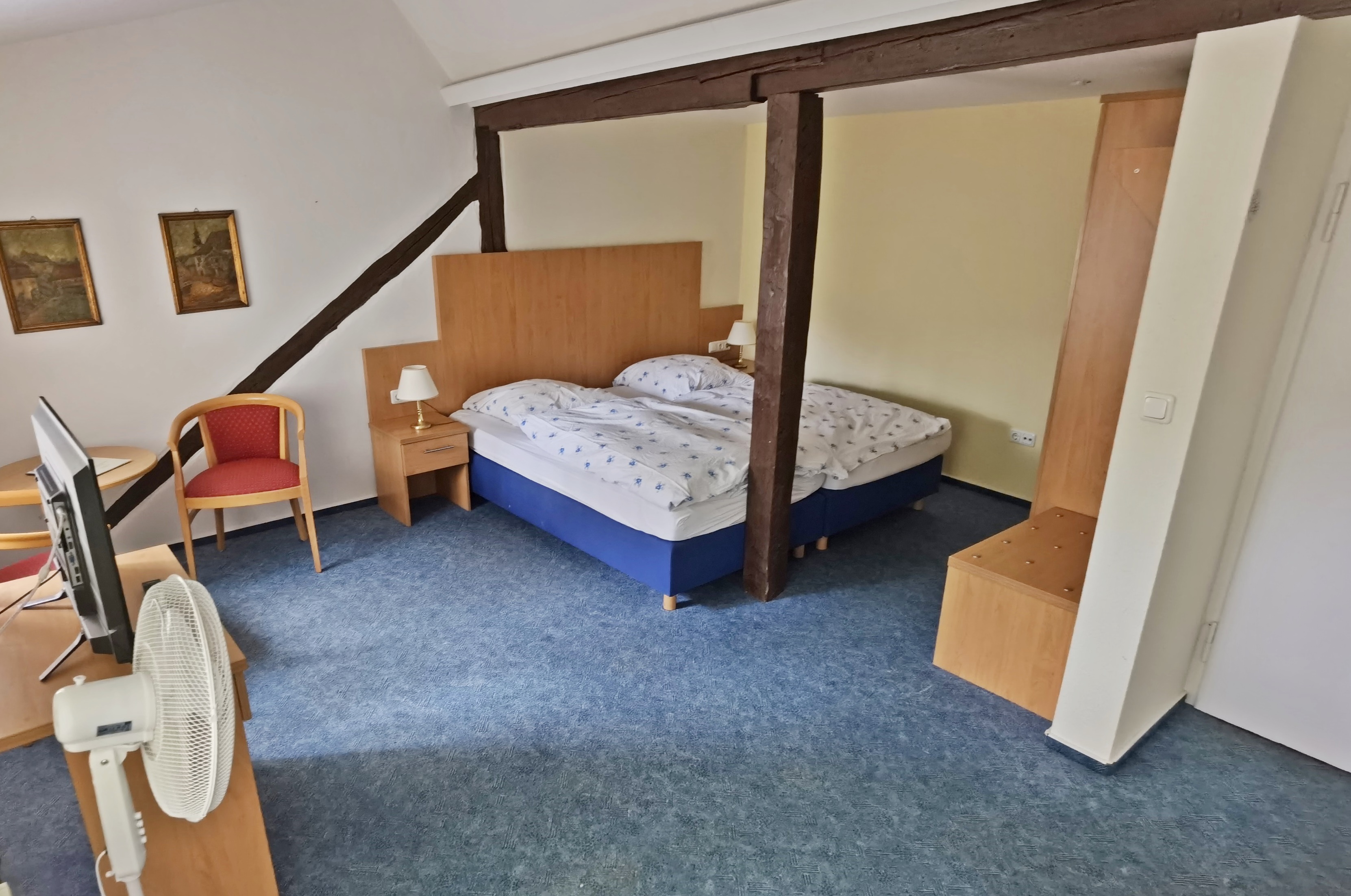 Fühlen Sie sich wohl in liebevoll eingerichteten Räumen. Es stehen 4 große Doppelzimmer, die auch als Einzel- bzw. zum Teil als 3 Bettzimmer genutzt werden können. Alle Zimmer sind mit Boxspringbetten, Dusche, Toilette, TV (Flachbildschirm) ausgestattet. Das reichhaltige Frühstück nehmen Sie in unserem historischen Rittersaal ein.Radler und Wanderer herzlich willkommen!