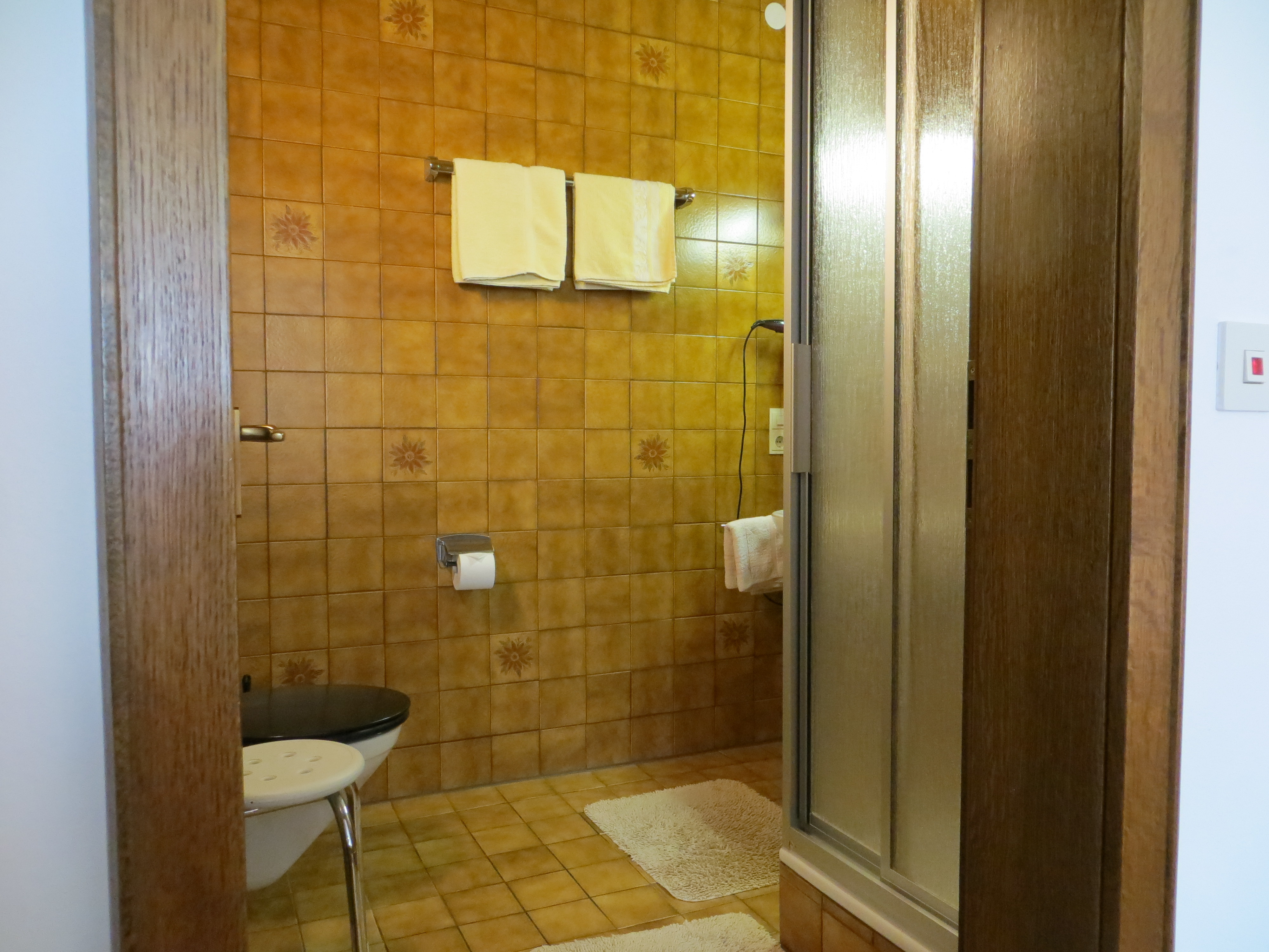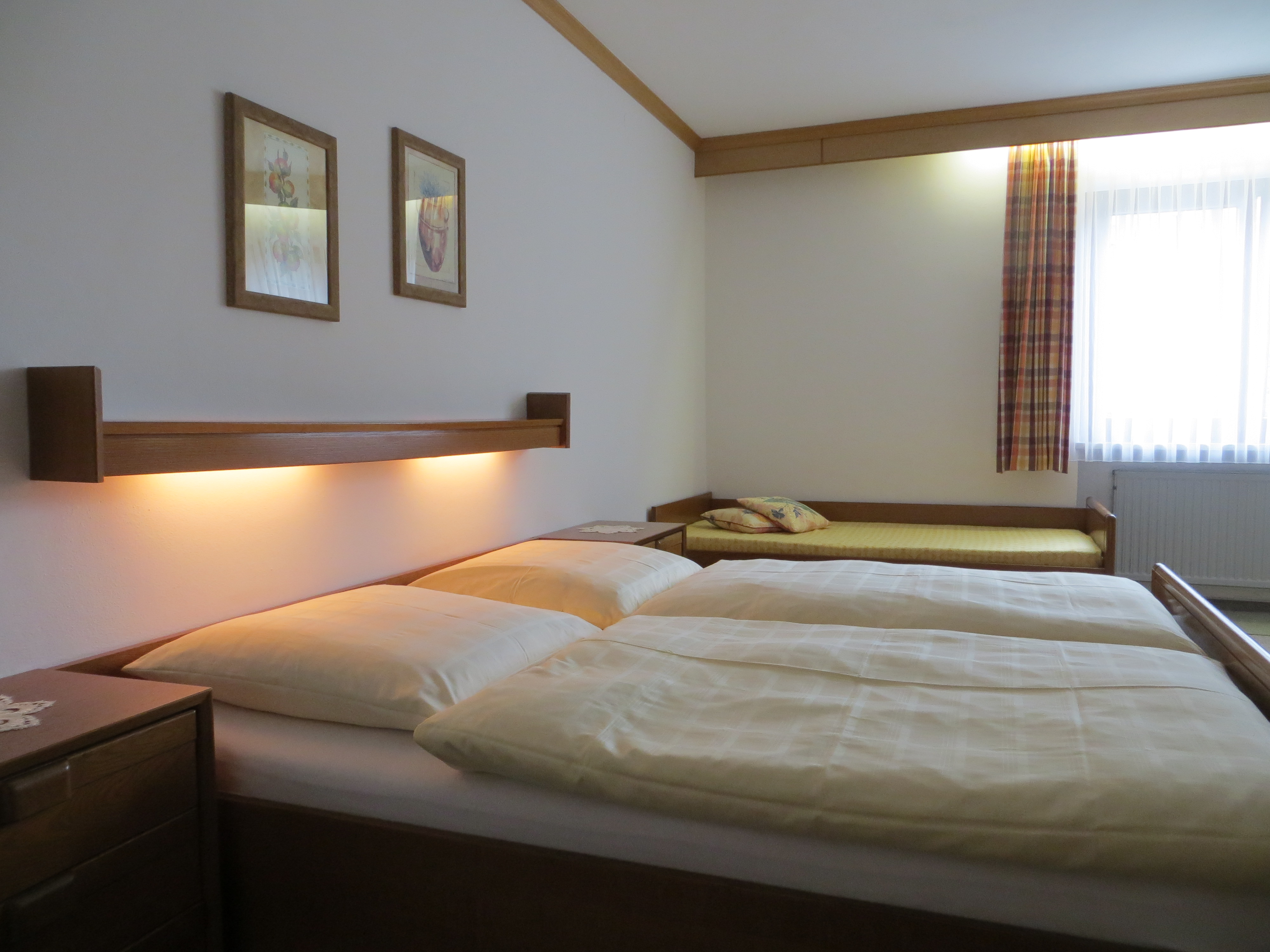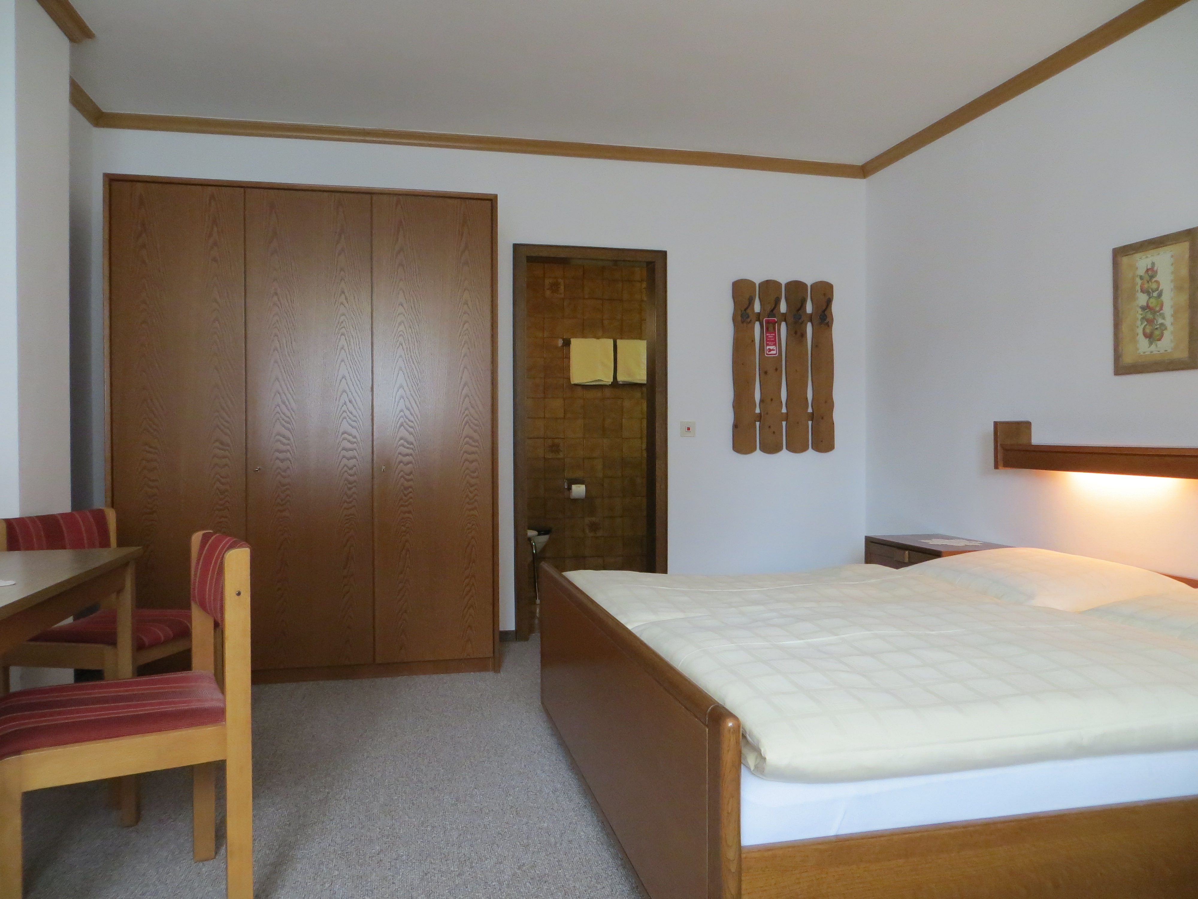 Das Zimmer mit Doppelbett, Schlafcouch Sat-TV und Sitzgelegenheit, lädt zum Verweilen ein. Das Badezimmer mit Dusche + WC und mit gemeinschafts Terrasse rundet das Gesamtbild ab.
