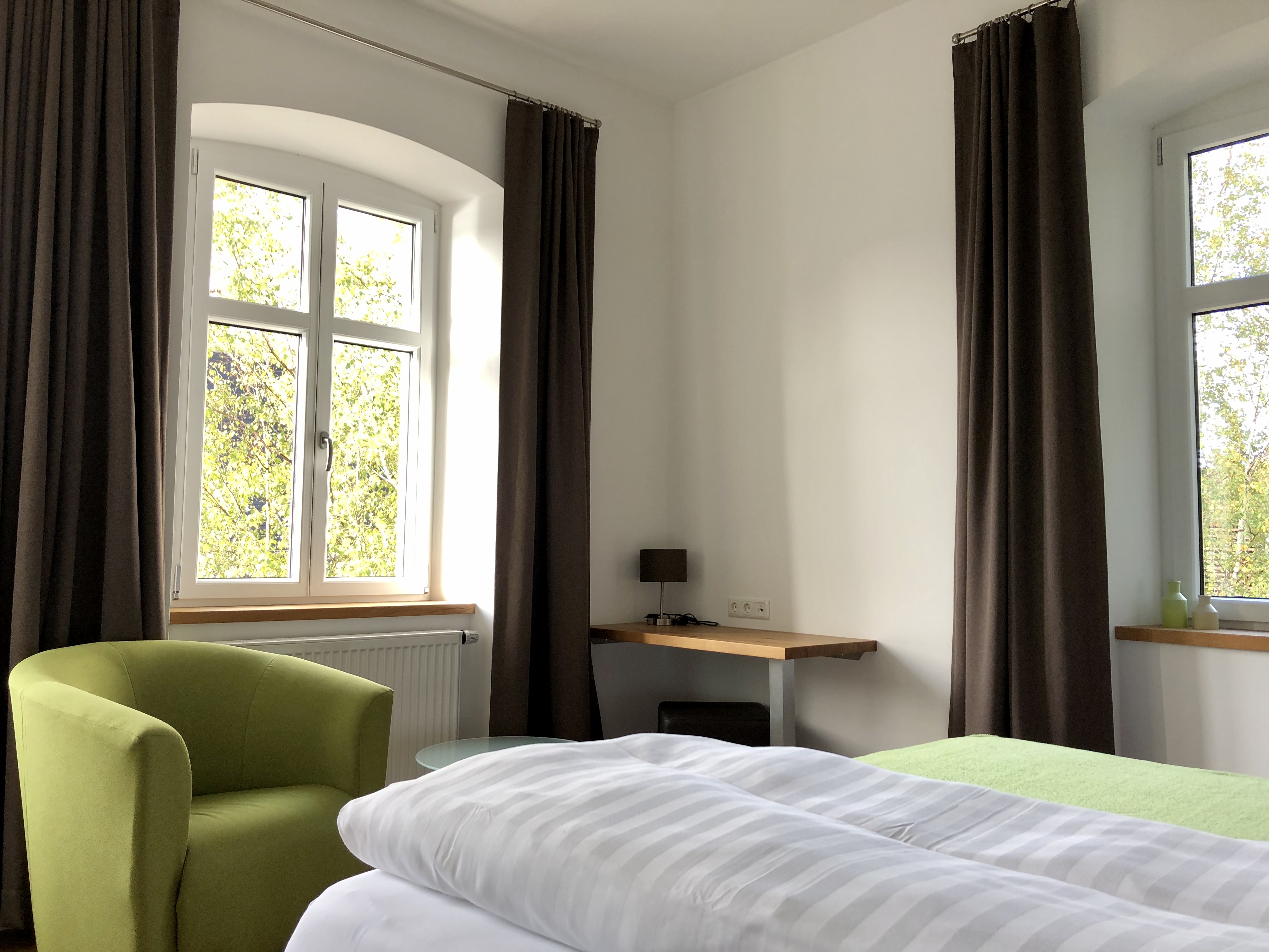 Alle Zimmer verfügen über ein Doppelbett, Bad mit Dusche und WC, Fernseher sowie einer Sitzgruppe.