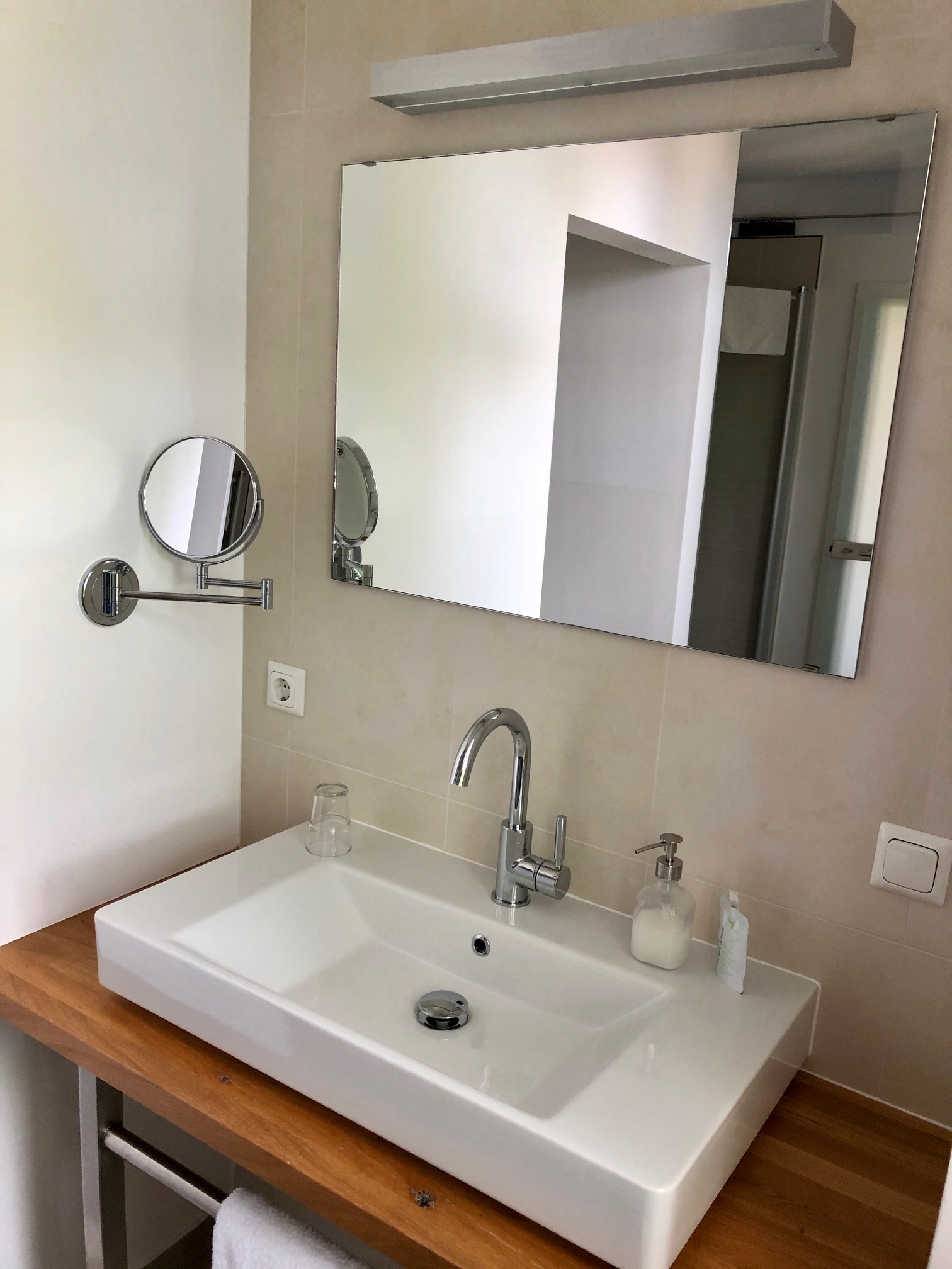 Das Ferienzimmer mit Schreibtisch und Doppelbett schließt sich ein sehr großes und exklusives Bad an.