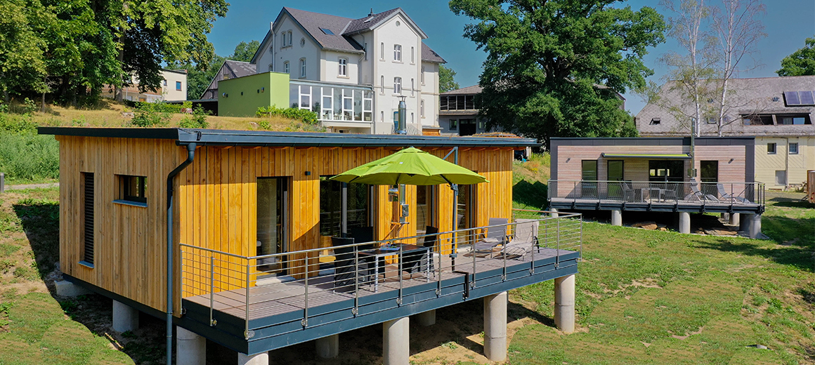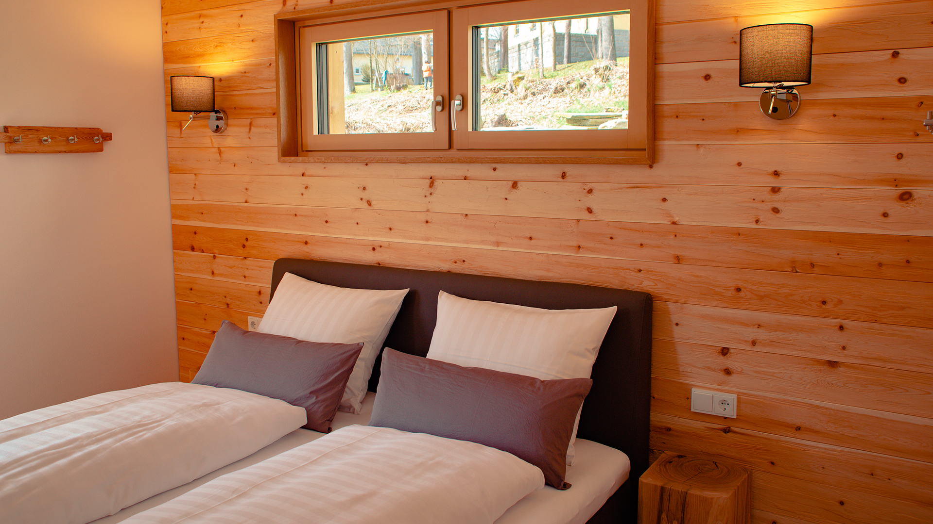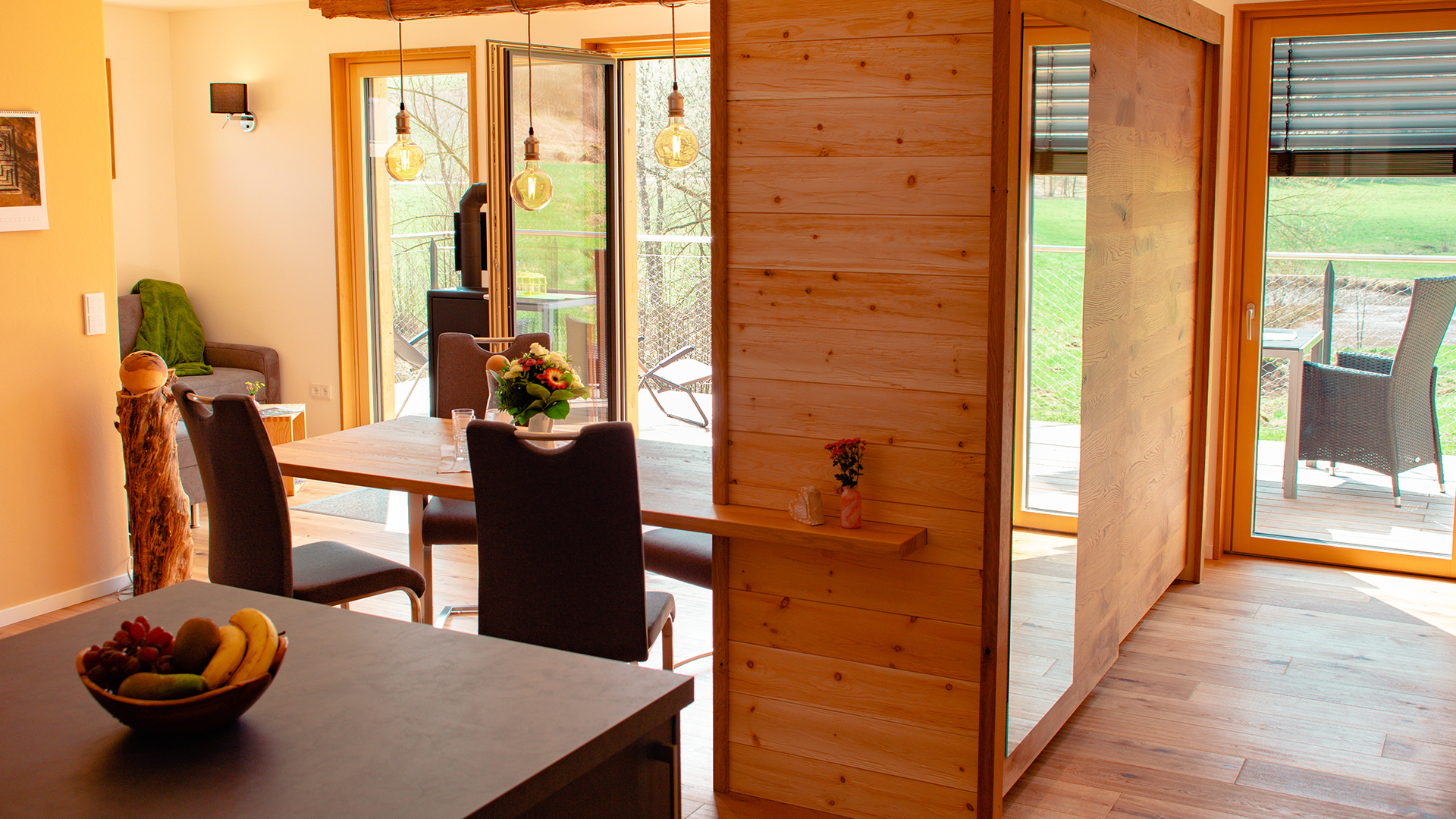 Was dürfen die Gäste im Ferienhaus Fichtelgebirge erwarten? Das Haus ist barrierefrei und bietet eine ausgesprochen hochwertige Ausstattung. Auf 59qm Wohnfläche und einer 25qm Sonnenterrasse mit elektrischer Markise lässt sich der Urlaub im Fichtelgebirge sehr angenehm gestalten. Zur Verfügung stehen zwei getrennte Schlafzimmer mit Boxspringbetten, eine hochwertige, vollausgestattete Küche sowie ein Bad mit großer Dusche (1,40 x 0,90 m).
