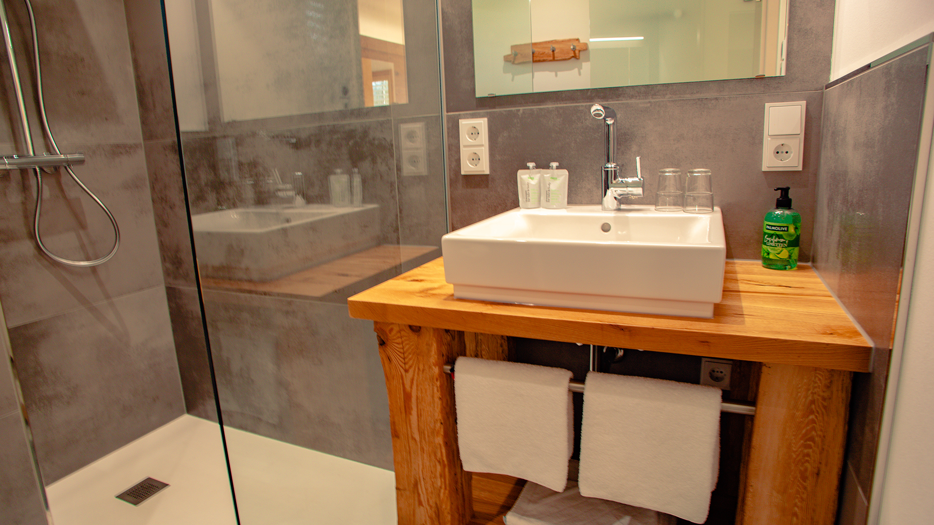 Alle Zimmer verfügen über ein Doppelbett, Bad mit Dusche und WC, Fernseher sowie einer Sitzgruppe.
