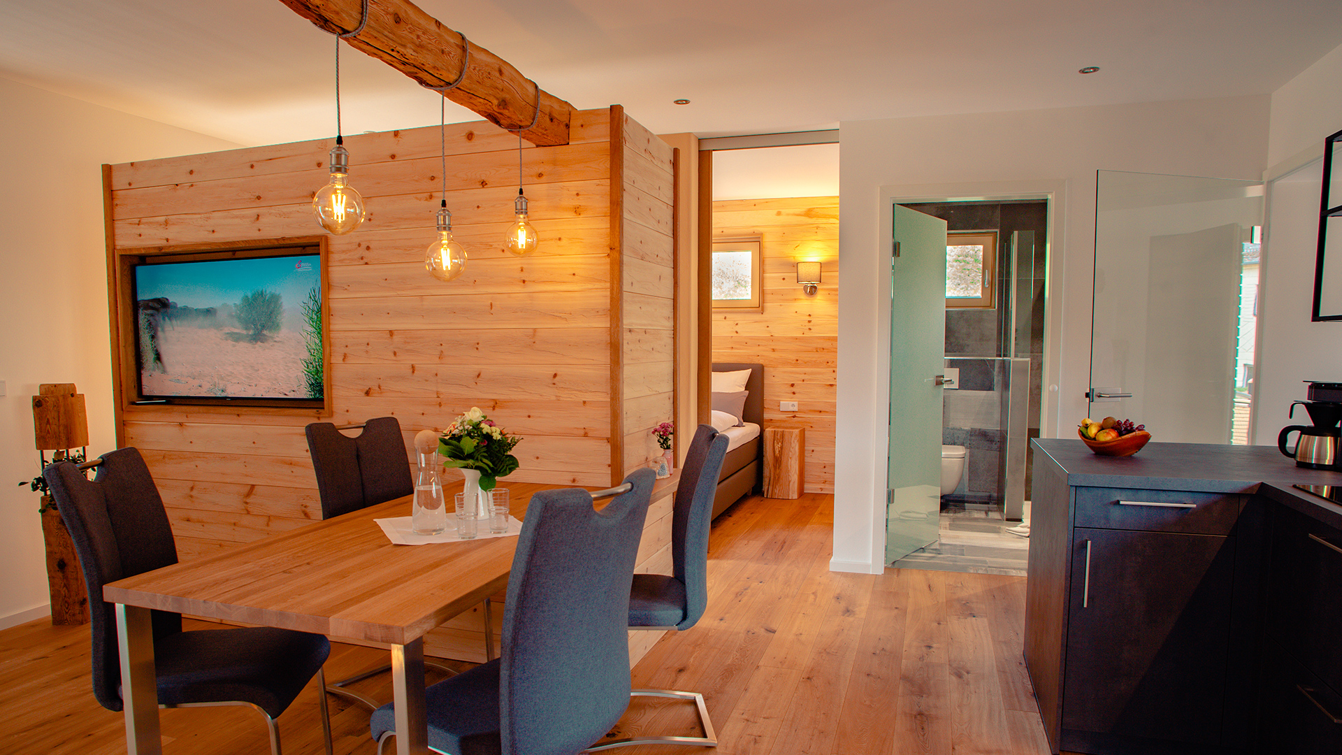 Alle Ferienwohnungen verfügen über ein Doppelbett, Küche oder Küchenzeile, Bad mit Dusche und WC, Flachbild Fernseher.