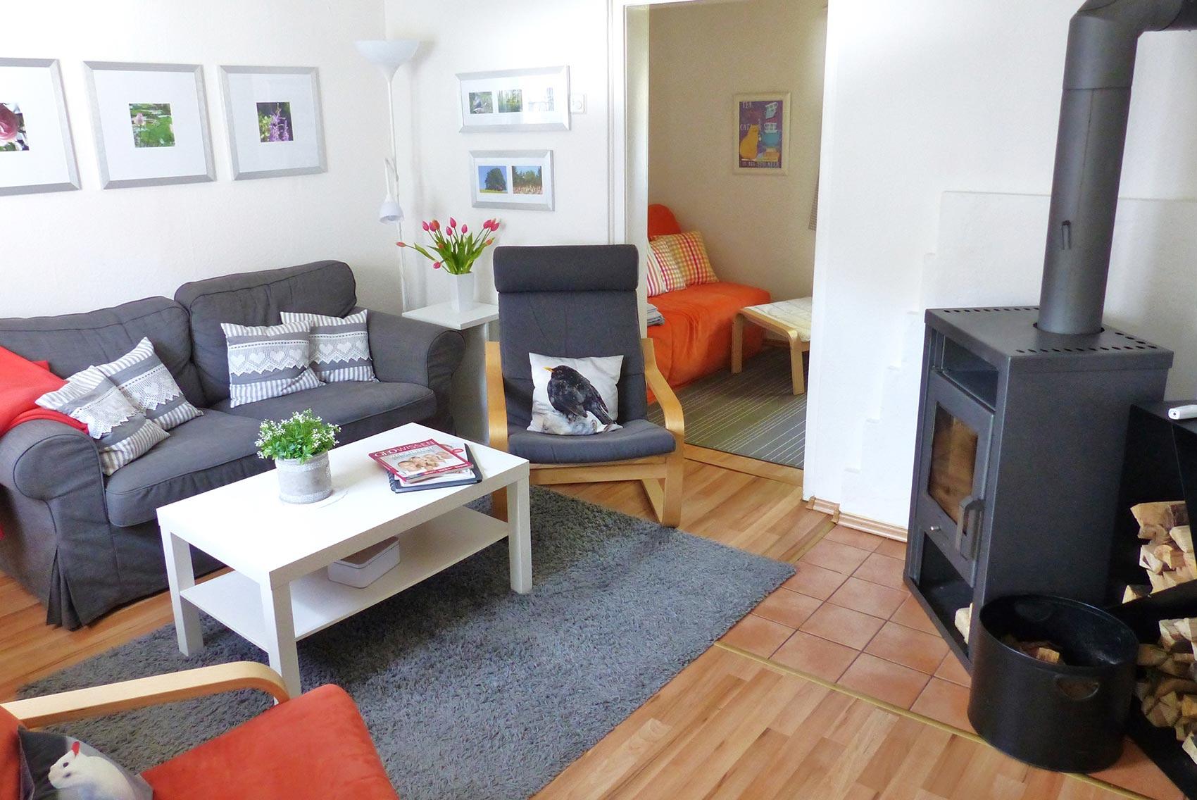80 m² Wohnfläche auf zwei Etagen mit Wohnzimmer, Spiel- und Lesezimmer, Landhausküche, zwei Schlafzimmer, auf Wunsch mit Kinderbettchen, ein Bad mit Dusche, WC und Waschmaschine. Das Wohnzimmer kann gemütlich mit einem Schwedenofen beheizt werden.