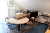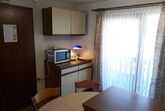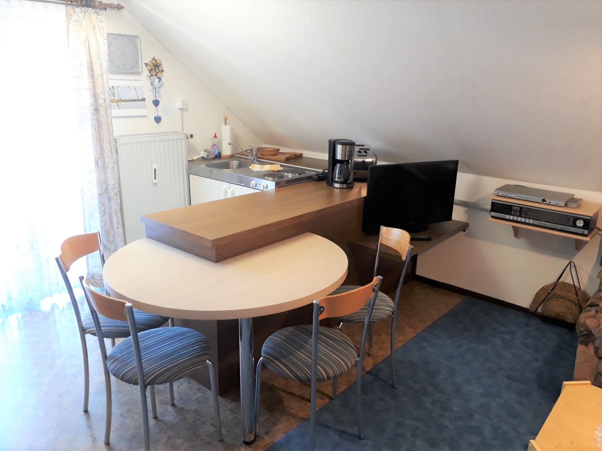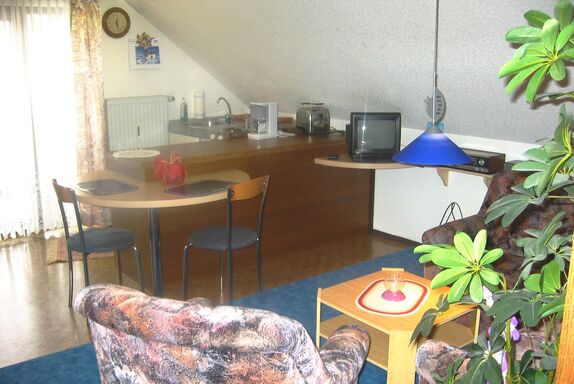 Im gemütlichen Wohnraum sitzen Sie auf der bequemen Polster-Eckgruppe vor dem Fernseher (Kabel). Wenn Sie auch im Urlaub gerne selbst ein schmackhaftes Essen oder eine rustikale Brotzeit zubereiten möchten, die komplett mit 2-Plattenherd, Mikrowelle, Kühlschrank, Kaffeemaschine, Eier- u. Wasserkocher, sowie Toaster voll ausgestatte Kleinküche wird Ihre zauberhafte Kreativität unterstützen. Ihre Tiefkühlkost lagern Sie in einer separaten Frostbox. Das Essen lassen Sie sich am halbrunden Essplatz mit Blick auf den Balkon - oder vielleicht auch dort Draußen schmecken. Alles in Allem eine Genießer-Wohnung.