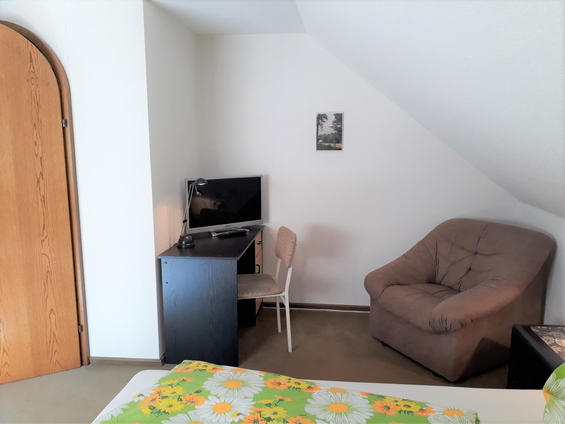 Das große Schlafzimmer hat ein Doppelbett. Eine zusätzliche Schreibtischecke und ein weiterer Fernseher mit Ruhe-Sessel ergänzen die Ausstattung.