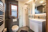 Das Bad im Erdgeschoß des Ferienhauses ist mit Dusche, Waschbecken und WC ausgestattet. Außerdem erhalten sie von uns Handtücher.
