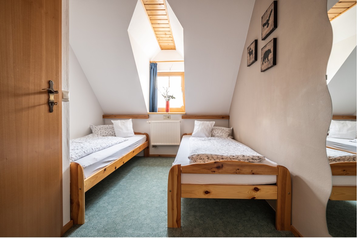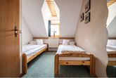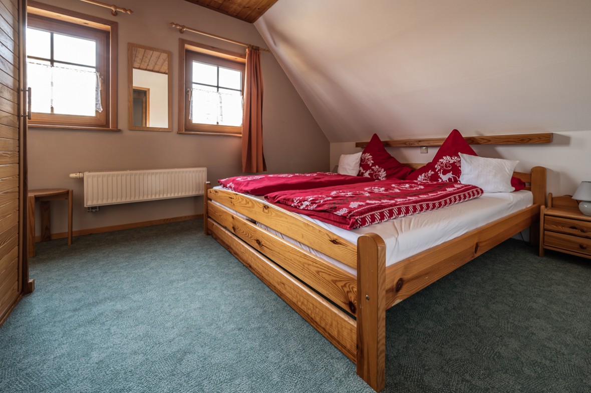 Über die Holztreppe gelangen sie zu den 2 Schlafräumen im Obergeschoß. Bei Bedarf steht ein Kinderbett und ein Schlafsofa zur Verfügung. Die Bettwäsche wird selbstverständlich gestellt.