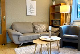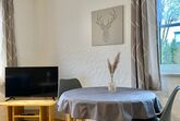 Die Ferienwohnung Gartenblick (unten) mit 45 qm Wohnfläche bietet Platz für bis zu zwei Personen. Die Küchenzeile ist ausgestattet mit einen E-Herd und Bachofen, Kühlschrank mit Gefrierfach, Mikrowelle, Geschirrspüler, Kaffeemaschine, Toaster, Eierkocher, Wasserkocher sowie Ess und Kochgeschirr in ausreichender Menge. Der gemütliche und helle Wohnraum und Essecke sind kombiniert. Über die Diele geht es in ein großzügiges separates Schlafzimmer mit Doppelbett. Das Badezimmer ist mit Dusche, WC und mit einen beleuchteten Kosmetik Spiegel und Fön ausgestattet.