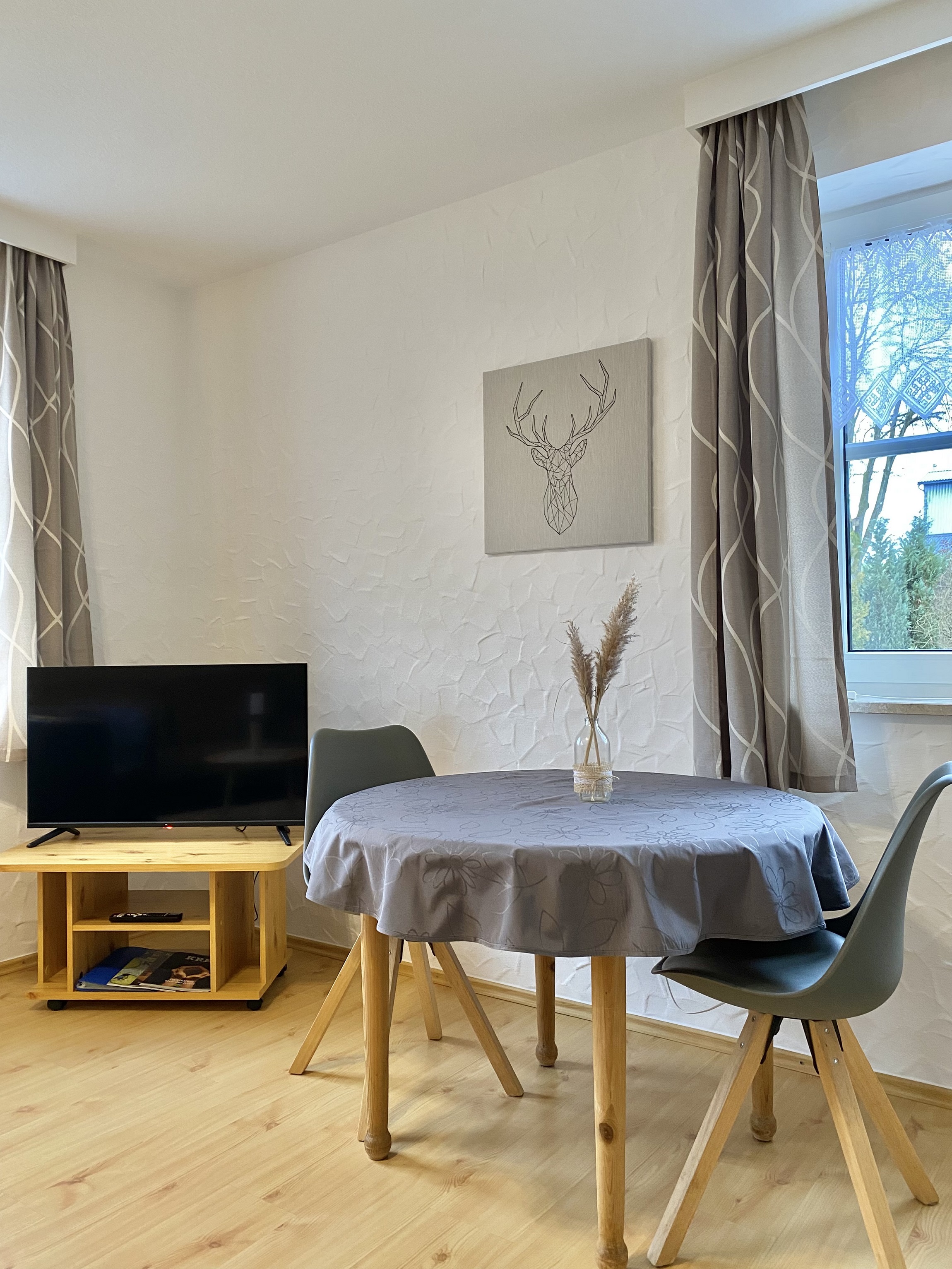 Die komplette Wäsche Ausstattung wie Bettwäsche,Handtücher Dusch und Geschirrtücher wird gestellt und auf Wunsch gerne gewechselt. In unserer Fewo. Gartenblick unten haben wir 1 Flach - Bildschirm mit Kabelanschluss, eine Stereoanlage sowie Telefon und kostenloses W-LAN. Selbstverständlich Können sie unseren schönen Garten mit Liegewiese und Grillplatz nutzen.