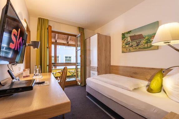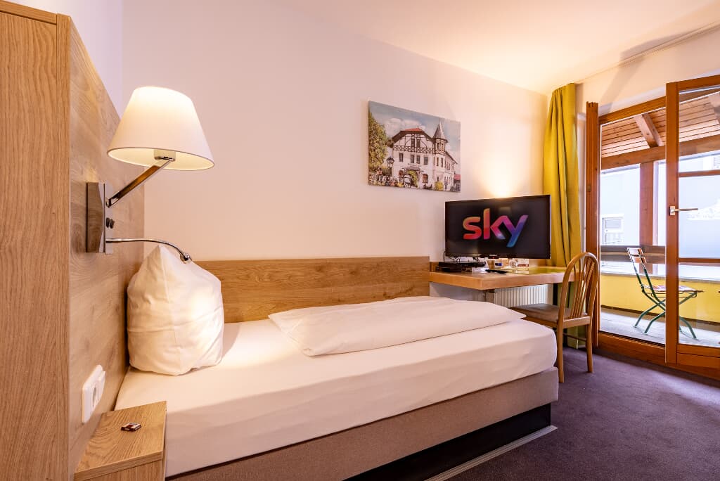 Fühlen Sie sich wohl in unseren Einzelzimmern mit hochwertigen Boxspringbetten ausgestattet, gratis Wasser, SKY und Highspeed WLAN