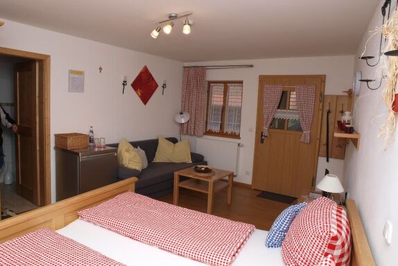 Liebevoll eingerichtetes Romantik-Doppelzimmer klassifiziert mit 3 Sternen und gemütlicher Sitzgruppe. Kühlschrank und Wasserkocher sind ebenfalls vorhanden.